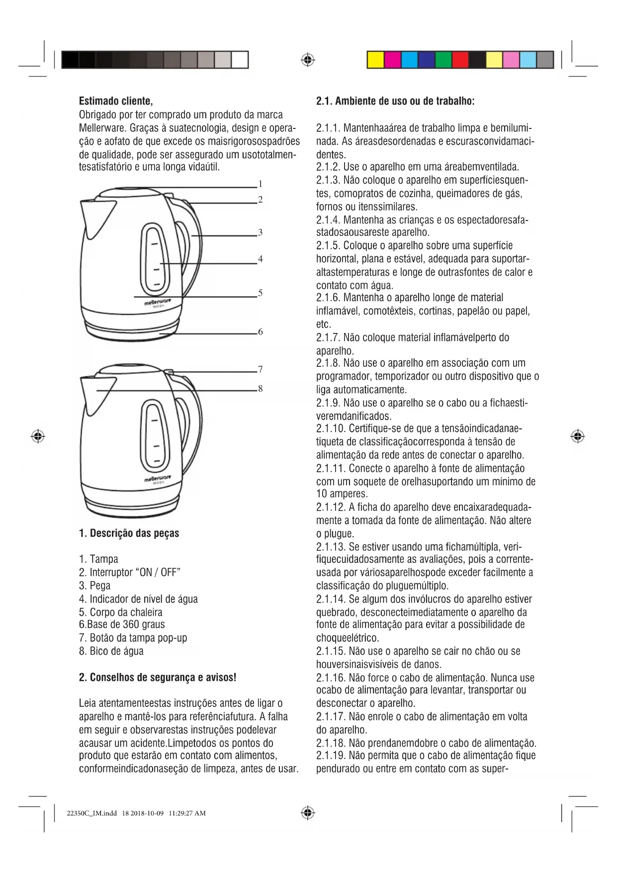 vapor que vem da tampa ou bico. ESPECIFICAÇÕES DO PRODUTO: Voltagem: 230 V ~ 50-60Hz Potência: 2000W Capacidade de água:mínimo 0.6L - máximo 1.7L 22350C_IM.indd 20 2018-10-09 11:29:28 AMGuia de solução de problemas Problema Razão Açao Precaução Chaleira está vazandoágua Pode ser a condensação. Isso é normal se ser utilizadováriasvezes em sucessão Estachaleira é apenas para uso doméstico. Chaleira está cheiademais. Despejeaáguaaté o nível“MAX.” Se aáguasobrecarregada- pode ser expulsa da chaleira, resultando em um perigo. A ficha estácolando. Certifique-se de que ointer- ruptorestejalimpo. Mantenha o aparelho longe de salpicos de cozinha. Chaleira não funciona A tomada doméstica está desligada. Ligue a tomada doméstica. Certifique-se de que aágua- cobre o elemento antes de operar. A tomada doméstica não está funcionando. Verifique a tomada com outrosaparelhos O aparelho deve ser de potênciasemelhante para evitarsobrecargas. A chaleira não está encaixa- da corretamente na base. Assente a chaleira na base corretamente. A vida da chaleiraseráredu- zida se não estiver sentado na base corretamente. Hidromassagemdesliga a fonte de alimentação O circuitoestá sobrecar- regado. Desconectetodos os aparelhosconectadosaomes- mocircuito. Observe que pode haver atécincotomadas de tomada doméstica em umcircuito. Chaleira leva muito tempo para ferver O element tem depósitos de calcário Descalcifica-o usando uma descalcificaçãopatenteada ou solução de ácidocítrico. Se não for bemsucedido, um novo elementopode ser necessário. Chaleiras com escalaterão uma vidaútilreduzida. Lim- peaescalaregularmente. Chaleiras com calcário O elemento tem depósitos de calcário. Descalcifica-o usando uma descalcificaçãopatenteada ou solução de ácidocítrico. Se não for bemsucedido, um novo elementopode ser necessário. Chaleiras com escalaterão uma vidaútilreduzida. Lim- peaescalaregularmente. Chaleira está enferrujadalá- foraChaleira não funciona O depósito de vapor foi oxidado e transformado em corlaranja. Limpesuachaleiraapós cada uso para manter a temper- aturaseca. Manterqualquer aparelho limpo em todos os momen- tosprolongará a vidaútil do produto. O elemento está enferru- jando. Pontos de ferrugem no elemento. Depósitos de água no elemento. Algumasáreas têm água que resultará em manchaslaranja ou marrom. .Algumasmanchassãoduras e um descalcificadorpode não ser eficaz. Isso não deve afetar o funcionamento. Usaráguadestilada. Chaleira não desligaau- tomaticamente. A tampa não está posicio- nada corretamente ou está desligada. Coloca a tampa na chaleira com segurança. Aexpulsão do vapor do bico ou da tampapode ser um perigo. 22350C_IM.indd 21 2018-10-09 11:29:28 AMThank you for purchasing a Mellerware product. Mellerware guarantees that your product has been thoroughly inspected and tested before being dispatched and is free from mechanical and electrical defects and complies with the applicable safety standards. With every Mellerware product purchased you get a 2 year warranty as detailed in the terms and conditions below. First Year – 1 Year Retail Warranty: Should defects due to faulty parts or workmanship devel- op, under normal use, within 12 months from the original purchase date, please return the product to the store from where it was purchased for repair free of charge. However, for the custormer’s convenience we will replace products where the purchase price is equal to or less than R750 incl. VAT Second Year – 1 Year Extended Warranty Mellerware takes pride in their product quality and there- fore offer an extended 12 month warranty over and above the 1 Year Retail Warranty. Should defects due to faulty material or workmanship develop, under normal domestic use, after the 12 month period and within 24 months from the original date of purchase, please return the product postage pre-paid to Mellerware for repair. Mellerware will repair the product free of charge and return it to you directly. Mellerware will replace a product with a similar product in the same or better condition, if the repair can- not be conducted for whatever reason. NB: The 1 Year Extended Warranty is only valid for cus- tomers who have registered their warranty online at www. mellerware.co.za within the first year after making their purchase. See overleaf for details and instructions. Before returning your product, check the following: