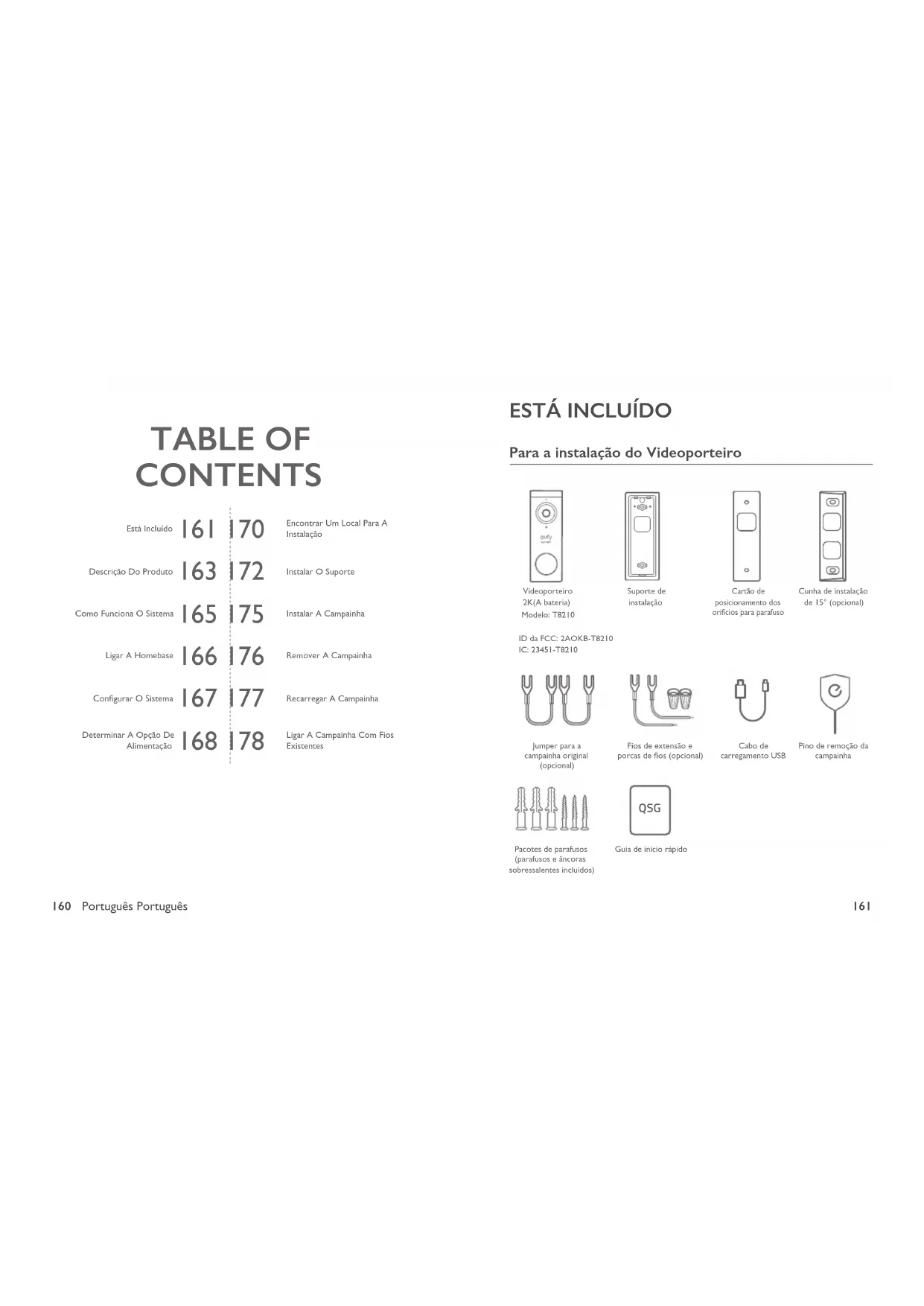 Para a instalação do Videoporteiro QSG Videoporteiro 2K(A bateria)Modelo: T8210Jumper para a campainha original (opcional)Pacotes de parafusos (parafusos e âncoras sobressalentes incluídos)Guia de início rápidoCartão de posicionamento dos orifícios para parafusoPino de remoção da campainhaCunha de instalação de 15° (opcional)Suporte de instalaçãoFios de extensão e porcas de os (opcional)ID da FCC: 2AOKB-T8210IC: 23451-T8210Cabo de carregamento USBEstá Incluído Encontrar Um Local Para A Instalação Descrição Do Produto Instalar O Suporte Como Funciona O Sistema Instalar A Campainha Ligar A Homebase Remover A Campainha Congurar O Sistema Recarregar A Campainha Determinar A Opção De Alimentação Ligar A Campainha Com Fios Existentes162 Português Português