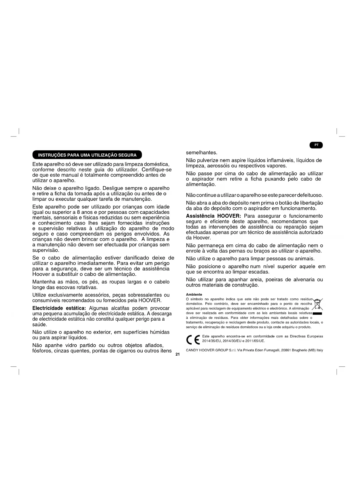 Controleer of de cyclonische eenheid schoongemaakt moet worden. Raadpleeg ¨Reinigen van de multi cycloon¨. F. Is de stofzuiger oververhit? Zo ja, dan duurt het ongeveer dertig minuten voordat het toestel weer klaar is voor gebruik. BELANGRIJKE INFORMATIE Originele reserveonderdelen en toebehoren van Hoover Gebruik uitsluitend originele reserveonderdelen van Hoover. Deze zijn verkrijgbaar bij uw Hoover Dealer. Als u onderdelen bestelt, vermeld dan altijd het modelnummer. Hoover Service Als u de onderhoudsdienst, reserveonderdelen of verbruiksgoederen op enig moment nodig heeft, neem dan alstublieft contact op met de lokale Hoover Service Vestiging. Kwaliteit De fabrieken van Hoover zijn op onafhankelijke wijze getest op kwaliteit. Onze producten worden vervaardigd aan de hand van een kwaliteitssysteem dat voldoet aan de vereisten van ISO 9001. Uw garantie De garantievoorwaarden voor dit toestel worden bepaald door onze vertegenwoordiger in het land waar het toestel wordt verkocht. Bijzonderheden omtrent deze voorwaarden zijn verkrijgbaar bij de dealer waar u het toestel hebt gekocht. Wanneer u aanspraak wilt maken op deze garantie, dan moet u het verkoop- of ontvangstbewijs voorleggen. Wijzigingen zijn zonder voorafgaande kennisgeving mogelijk.21 INSTRUÇÕES PARA UMA UTILIZAÇÃO SEGURA Este aparelho só deve ser utilizado para limpeza doméstica, conforme descrito neste guia do utilizador. Certique-se de que este manual é totalmente compreendido antes de utilizar o aparelho. Não deixe o aparelho ligado. Desligue sempre o aparelho e retire a cha da tomada após a utilização ou antes de o limpar ou executar qualquer tarefa de manutenção. Este aparelho pode ser utilizado por crianças com idade igual ou superior a 8 anos e por pessoas com capacidades mentais, sensoriais e físicas reduzidas ou sem experiência e conhecimento caso lhes sejam fornecidas instruções e supervisão relativas à utilização do aparelho de modo seguro e caso compreendam os perigos envolvidos. As crianças não devem brincar com o aparelho. A limpeza e a manutenção não devem ser efectuada por crianças sem supervisão. Se o cabo de alimentação estiver danicado deixe de utilizar o aparelho imediatamente. Para evitar um perigo para a segurança, deve ser um técnico de assistência Hoover a substituir o cabo de alimentação. Mantenha as mãos, os pés, as roupas largas e o cabelo longe das escovas rotativas. Utilize exclusivamente acessórios, peças sobressalentes ou consumíveis recomendados ou fornecidos pela HOOVER. Electricidade estática: Algumas alcatifas podem provocar uma pequena acumulação de electricidade estática. A descarga de electricidade estática não constitui qualquer perigo para a saúde. Não utilize o aparelho no exterior, em superfícies húmidas ou para aspirar líquidos. Não apanhe vidro partido ou outros objetos aados, fósforos, cinzas quentes, pontas de cigarros ou outros itens semelhantes. Não pulverize nem aspire líquidos inamáveis, líquidos de limpeza, aerossóis ou respectivos vapores. Não passe por cima do cabo de alimentação ao utilizar o aspirador nem retire a cha puxando pelo cabo de alimentação. Não continue a utilizar o aparelho se este parecer defeituoso. Não abra a aba do depósito nem prima o botão de libertação da aba do depósito com o aspirador em funcionamento. Assistência HOOVER: Para assegurar o funcionamento seguro e eciente deste aparelho, recomendamos que todas as intervenções de assistência ou reparação sejam efectuadas apenas por um técnico de assistência autorizado da Hoover. Não permaneça em cima do cabo de alimentação nem o enrole à volta das pernas ou braços ao utilizar o aparelho. Não utilize o aparelho para limpar pessoas ou animais. Não posicione o aparelho num nível superior aquele em que se encontra ao limpar escadas. Não utilizar para apanhar areia, poeiras de alvenaria ou outros materiais de construção. Ambiente O símbolo no aparelho indica que este não pode ser tratado como resíduo doméstico. Pelo contrário, deve ser encaminhado para o ponto de recolha aplicável para reciclagem de equipamento eléctrico e electrónico. A eliminação deve ser realizada em conformidade com as leis ambientais locais relativas à eliminação de resíduos. Para obter informações mais detalhadas sobre o tratamento, recuperação e reciclagem deste produto, contacte as autoridades locais, o serviço de eliminação de resíduos domésticos ou a loja onde adquiriu o produto. Este aparelho encontra-se em conformidade com as Directivas Europeias 2014/35/EU, 2014/30/EU e 2011/65/UE. CANDY HOOVER GROUP S.r.l. Via Privata Eden Fumagalli, 20861 Brugherio (MB) Italy PT22 A. Pedal Ligar/Desligar B. Tampa do ltro do pré-motor C. Manípulo do contentor D. Corpo interno do depósito E. Botão de libertação da aba do depósito F. Detetor mecânico de depósito cheio G. Botão do fecho da extremidade do tubo exível H. Tubo exível