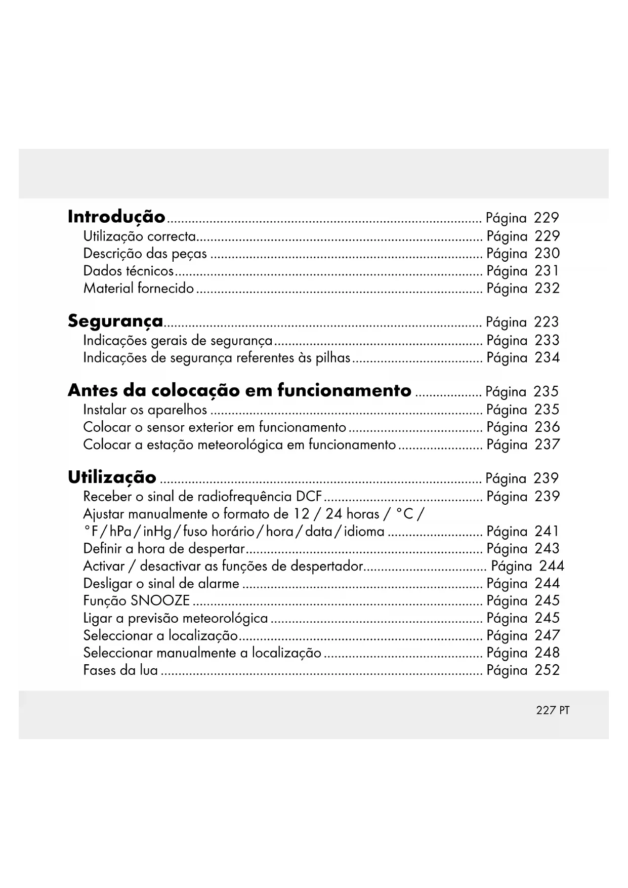 Compartimento de pilhas Dados técnicos Estação meteorológica: Área de medição da temperatura: 0 a +50 °C +32 a +122 °F Resolução de temperatura: 0,1 °C Amplitude de medição da humidade do ar: 20–95% Resolução da humidade do ar: 1 % Sinal de radiofrequência: DCF232 PT Pilha: 3 x AA, 1,5 V (corrente contínua) Gama da pressão atmosférica: 850 - 1050hPa Sensor exterior: Área de medição da temperatura: –20 a +65 °C –4 a +149 °F Amplitude de medição da humidade do ar: 20 – 95% Resolução da humidade do ar: 1 % Sinal de transmissão HF: 433 MHz Amplitude de transmissão HF: no máx. 30 metros (no terreno livre) Pilha: 2 x AA, 1,5 V (corrente contínua) Tipo de proteção: IPX4 (protegido contra salpicos de água) Material fornecido 1 Estação meteorológica 1 Sensor exterior 3 Pilhas AA, 1,5 V (pré-instaladas) 2 Pilhas AA, 1,5 V (pré-instaladas) 1 Manual de instruções233 PT Segurança Leia todas as indicações de segurança e instruções. A inobservância das indica- ções de segurança e instruções pode ter como consequência choques eléctricos, incêndios e / ou ferimentos graves. GUARDE TODAS AS INDICAÇÕES DE SEGURANÇA E INSTRUÇÕES PARA FUTURA CONSULTA! Indicações gerais de segurança As crianças frequentemente subestimam os perigos. Mantenha sempre as crianças afastadas do artigo. Esse produto pode ser utilizado por crianças a partir dos 8 anos, assim como por pessoas com capacidades físicas, sensoriais ou mentais reduzidas ou defi- ciências na experiência e conhecimento, se forem vigiadas ou instruídas em relação ao uso seguro do produto e se compreenderem os perigos que daí possam resultar. As crianças não devem brincar com o produto. A limpeza e a manutenção pelo utilizador não devem ser realizadas por crianças sem vigilância Não coloque o produto em funcionamento se este estiver danificado.234 PT Indicações de segurança referentes às pilhas PERIGO DE MORTE! As pilhas podem ser engolidas, o que constitui perigo de morte. Se uma pilha for engolida, deve procurar imediatamente ajuda médica. Retire as pilhas do produto, se este não for utilizado durante muito tempo. CUIDADO! PERIGO DE EXPLOSÃO! Nunca recarregue as pilhas! Ao colocar as pilhas, tenha em atenção a polaridade correcta! Esta é indicada nos compartimentos das pilhas. Se necessário, limpe os contactos das pilhas e do aparelho antes da sua colocação. Retire de imediato as pilhas gastas do produto. Existe um elevado risco de derrame! As pilhas não devem ser depositadas no lixo doméstico! Cada consumidor é legalmente obrigado a eliminar correctamente as pilhas! Mantenha as pilhas fora do alcance das crianças, não as atire para o fogo, proteja-as contra curto-circuitos e não as desmonte. Substitua sempre todas as pilhas ao mesmo tempo. Utilize apenas pilhas do mesmo tipo. Se as pilhas começarem a derramar ácido dentro do produto, retire-as imediatamente para evitar danos no mesmo! Evite o contacto com a pele, os olhos e mucosas. No caso de contacto com o ácido da pilha, lave a zona afectada com bastante água e / ou consulte um médico!235 PT Antes da colocação em funcionamento Instalar os aparelhos Coloque as pilhas, primeiro, no sensor exterior e depois na esta- ção meteorológica. CUIDADO! Ao escolher o local de instalação, certifique-se de que os apare- lhos não ficam expostos à luz solar directa, vibrações, pó, calor, frio e humidade. Não coloque os aparelhos nas proximidades de fontes de calor, como por ex., aquecedores. Caso contrário, os aparelhos podem ficar danificados. Não coloque os aparelhos sem uma protecção adequada sobre superfícies de valor ou delicadas. Caso contrário, as mesmas poderão ficar danificadas. Certifique-se de que os aparelhos contíguos não funcionam com a mesma fre- quência de 433 MHz. Estes aparelhos poderão causar interferências na ligação por rádio. Não coloque os aparelhos junto ou em cima de placas metálicas. A radio- transmissão entre os aparelhos pode ser reduzida. Não instale os aparelhos em edifícios em betão armado, tais como, aeroportos, arranha-céus, fábricas ou caves. A radiotransmissão entre os aparelhos pode ser significativamente influenciada.236 PT Colocar o sensor exterior em funcionamento Retire a tampa do compartimento das pilhas na parte traseira do sensor exterior. Retire a fita de segurança das pilhas. O sensor exterior está agora operacional e o LED de controlo