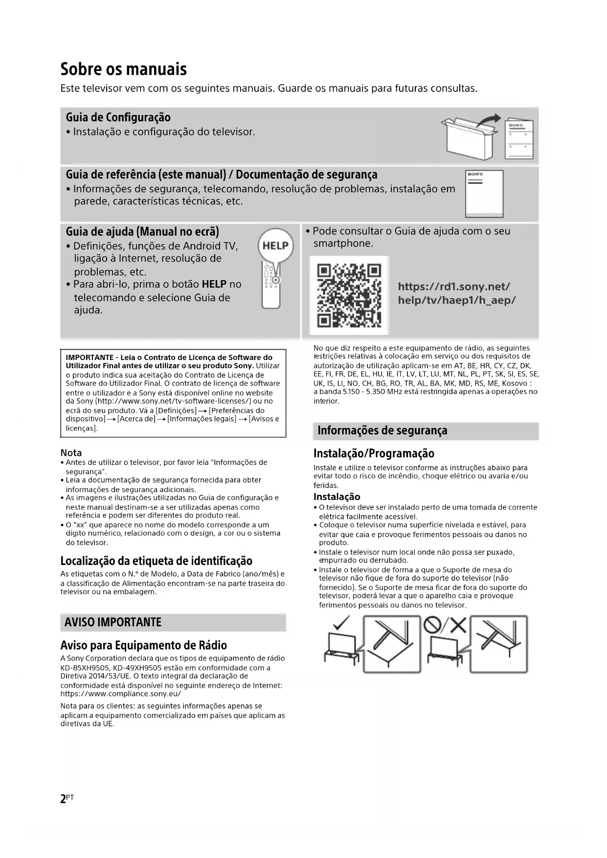 - As imagens e ilustrações utilizadas no Guia de con figuração e neste manual destinam-se a ser utilizadas apenas como referência e podem ser diferentes do produto real.• O “xx” que aparece no nome do modelo corresponde a um dígito numérico, relacionado com o design, a cor ou o sistema do televisor. Localização da etiqueta de identificação As etiquetas com o N.º de Modelo, a Data de Fabrico (ano/mês) e a classificação de Alimentação encontram-se na parte traseira do televisor ou na embalagem. AVISO IMPORTANTE Aviso para Equipamento de Rádio A Sony Corporation declara que os tipos de equipamento de rádio KD-85XH9505, KD-49XH9505 estão em conformidade com a Diretiva 2014/53/UE. O texto integral da declaração de conformidade está disponível no seguinte endereço de Internet: https://www.compliance.sony.eu/Nota para os clientes: as seguintes informações apenas se aplicam a equipamento comercializado em países que aplicam as diretivas da UE.No que diz respeito a este equipamento de rádio, as seguintes estrições relativas à colocação em serviço ou dos requisitos de autorização de utilização aplicam-se em AT, BE, HR, CY, CZ, DK, EE, FI, FR, DE, EL, HU, IE, IT, LV, LT, LU, MT, NL, PL, PT, SK, SI, ES, SE, UK, IS, LI, NO, CH, BG, RO, TR, AL, BA, MK, MD, RS, ME, Kosovo : a banda 5.150 - 5.350 MHz está restringida apenas a operações no int erior. Informações de segurança Instalação/Programação Instale e utilize o televisor conforme as instruções abaixo para evitar todo o risco de incêndio, choque elétrico ou avaria e/ou feridas. Instalação