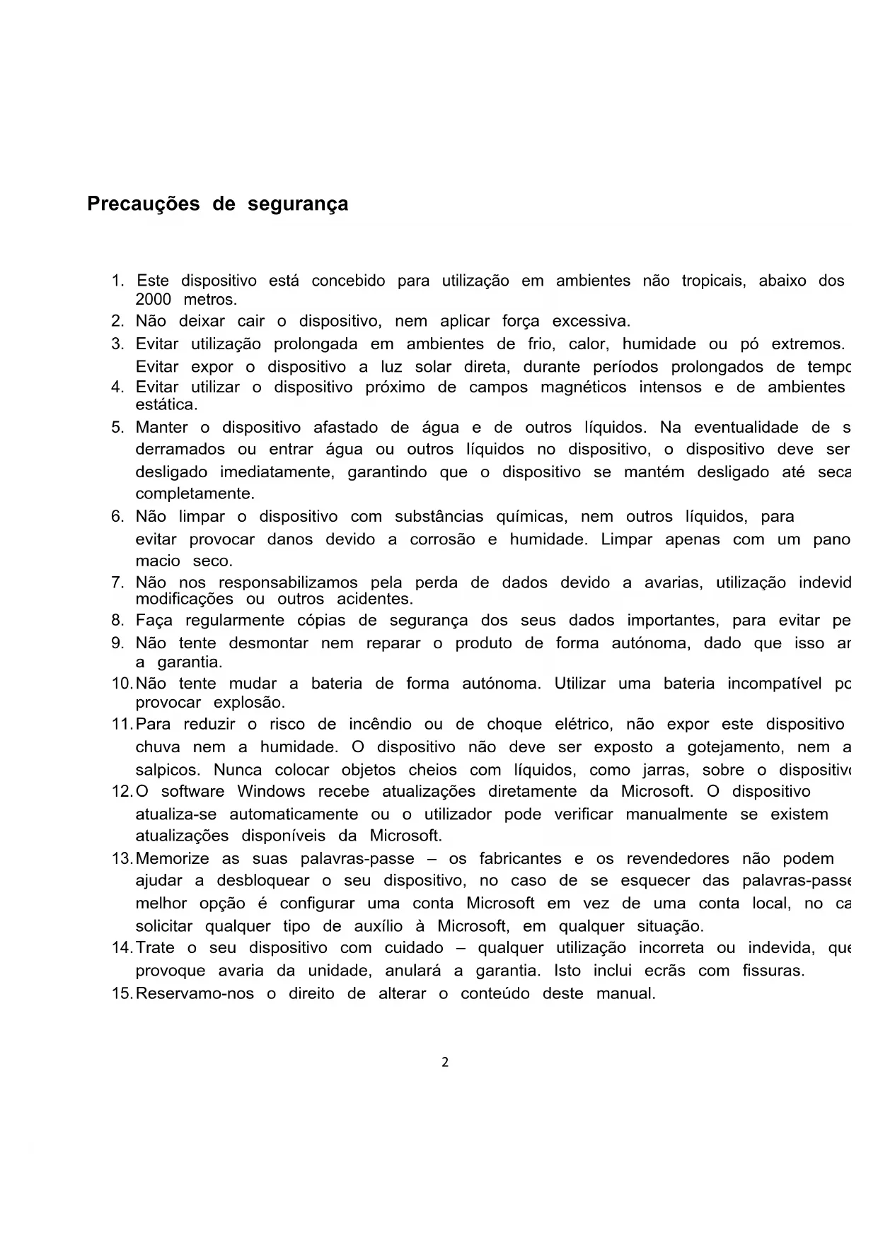 Evitar utilização prolongada em ambientes de frio, calor, humidade ou pó extremos. Evitar expor o dispositivo a luz solar direta, durante períodos prolongados de tempo.