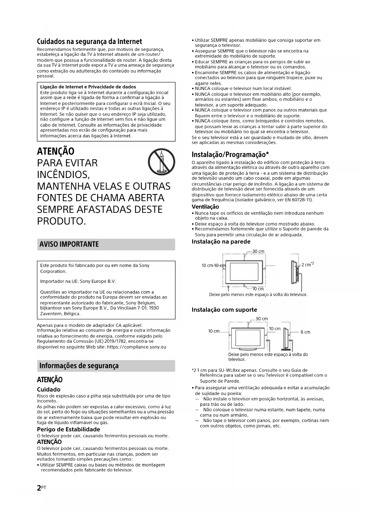 PRODUTO. AVISO IMPORTANTE Apenas para o modelo de adaptador CA aplicável: Informação relativa ao consumo de energia e outra informação relativa ao fornecimento de energia, conforme exigido pelo Regulamento da Comissão (UE) 2019/1782, encontra-se disponível no seguinte Web site: https://compliance.sony.eu Informações de segurança ATENÇÃO Cuidado Risco de explosão caso a pilha seja substituída por uma de tipo incorreto. As pilhas não podem ser expostas a calor excessivo, como à luz do sol, perto do fogo ou situações semelhantes ou a uma pressão de ar extremamente baixa que pode resultar em explosão ou fuga de líquido inflamável ou gás. Perigo de Estabilidade O televisor pode cair, causando ferimentos pessoais ou morte. ATENÇÃO O televisor pode cair, causando ferimentos pessoais ou morte. Muitos ferimentos, em particular nas crianças, podem ser evitados tomando simples precauções como:
