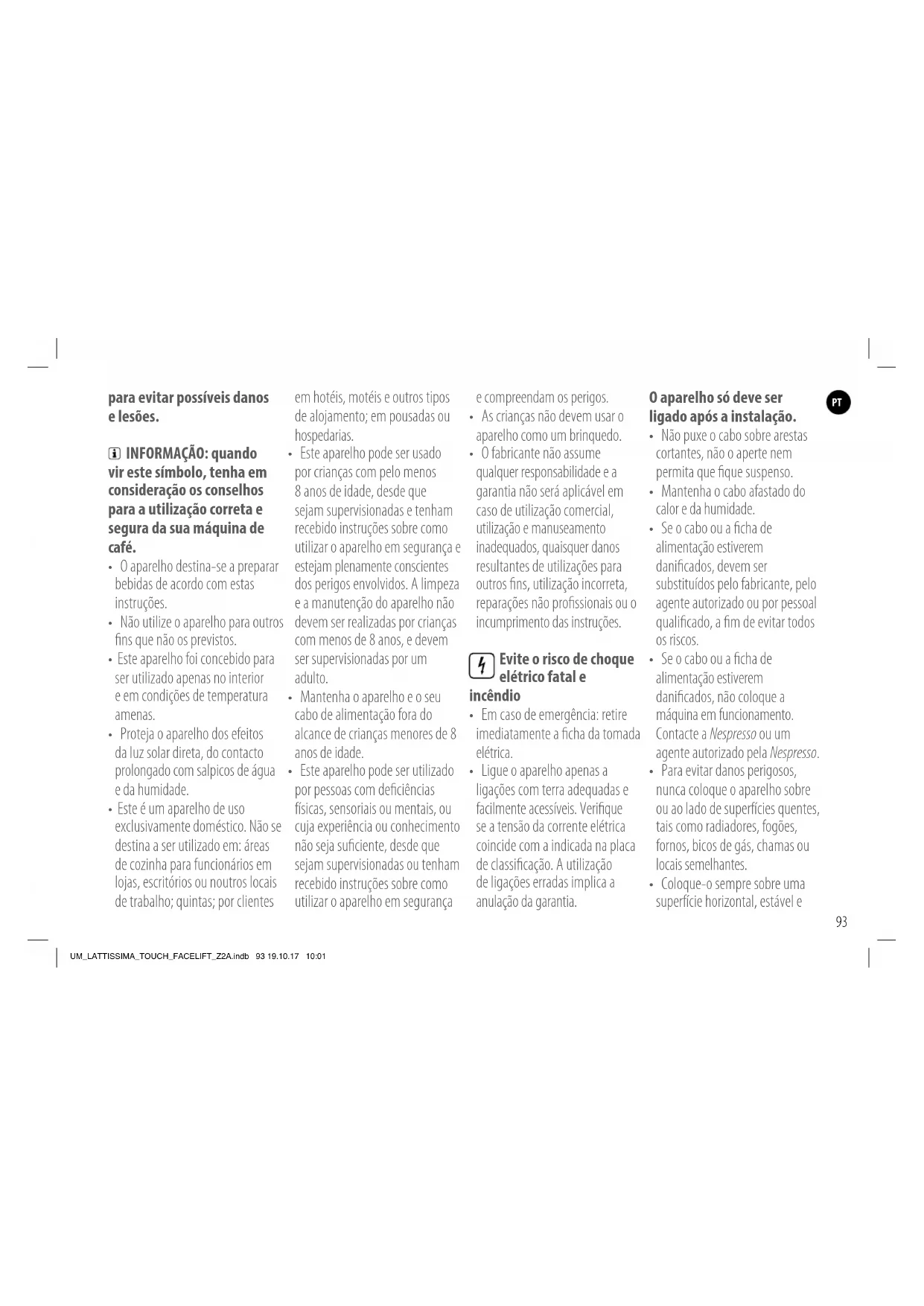 UM_LATTISSIMA_TOUCH_FACELIFT_Z2A.indb 92 19.10.17 10:01PT para evitar possíveis danos e lesões. INFORMAÇÃO: quando vir este símbolo, tenha em consideração os conselhos para a utilização correta e segura da sua máquina de café.