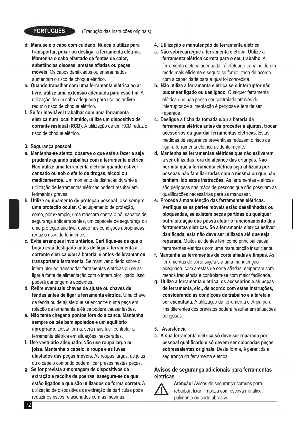 Atenção! Avisos de segurança comuns para rebarbar, lixar, limpeza com escova metálica, polimento ou corte abrasivo:73 (Tradução das instruções originais) PORTUGUÊS u Esta ferramenta elétrica destina-se a ser utilizada como rebarbadora, lixadora, escova metálica, polidora ou ferramenta de corte. Leia todos os avisos de segurança, instruções, ilustrações e especicações fornecidas com esta ferramenta elétrica. O não cumprimento de todas as instruções indicadas abaixo pode resultar em choque elétrico, incêndio e/ou lesões graves. u As operações para as quais a ferramenta elétrica não foi concebida poderão criar perigo e causar ferimentos. u Não utilize acessórios que não tenham sido especicamente concebidos e recomendados pelo fabricante da ferramenta. O facto de um acessório poder ser instalado na sua ferramenta elétrica não garante um funcionamento seguro do mesmo. u A velocidade nominal do acessório deve ser, no mínimo, equivalente à velocidade máxima indicada na ferramenta elétrica. Os acessórios que forem utilizados a uma velocidade superior à respetiva velocidade nominal poderão fragmentar-se e projetar esses fragmentos. u O diâmetro exterior e a espessura do acessório devem estar dentro dos limites de capacidade da ferramenta elétrica. Não será possível proteger ou controlar de forma adequada acessórios com o tamanho incorreto. u Ao enroscar acessórios, estes devem coincidir com a rosca do eixo da rebarbadora. No que respeita a acessórios montados com anges, o orifício de xação do acessório deve corresponder ao diâmetro de localização da ange. Os acessórios que não correspondam ao tamanho dos elementos de montagem da ferramenta elétrica irão funcionar de forma desequilibrada e vibrar de modo excessivo, podendo causar a perda do controlo da ferramenta. u Não utilize um acessório danicado. Antes de cada utilização, inspecione se os acessórios, por exemplo, os discos abrasivos, apresentam rachas ou fendas, se a proteção de apoio apresenta rachas, desgaste excessivo, e se a escova metálica tem os soltas ou rachadas. Se deixar cair a ferramenta elétrica ou os acessórios, verique se apresentam danos ou se colocou um acessório sem danos. Depois de inspecionar e instalar um acessório e funcionar com a ferramenta elétrica à velocidade máxima sem carga durante um minuto. Os acessórios danicados irão normalmente fragmentar-se durante este período de teste. u Utilize equipamento de proteção pessoal. Dependendo da operação, use uma viseira ou óculos de proteção. De acordo com o necessário, use uma máscara contra o pó, protetores auditivos, luvas e um avental de trabalho capaz de o proteger contra pequenos fragmentos abrasivos ou da peça de trabalho. A proteção ocular tem de ser capaz de o proteger contra a projeção de detritos resultantes de várias operações. A máscara anti-poeira ou o respirador deve ser capaz de ltrar partículas geradas pelo que está a fazer. A exposição prolongada a ruídos de elevada intensidade poderá causar perda de audição. u Mantenha as pessoas a uma distância segura da área de trabalho. Qualquer pessoa que entre no perímetro da área de trabalho tem de usar equipamento de proteção pessoal. Poderá dar-se o caso de fragmentos da peça de trabalho ou de um acessório partido serem projetados para longe e causarem ferimentos fora da área de trabalho imediata. u Segure a ferramenta elétrica apenas pelas superfícies isoladas especícas para o efeito ao efetuar uma operação em que o acessório de corte possa entrar em contacto com os ocultos ou com o próprio cabo da ferramenta. Um acessório de corte que entre em contacto com um o com tensão elétrica poderá fazer com que as peças de metal expostas da ferramenta conduzam eletricidade e eletrocutem o utilizador. u Utilize grampos ou outro sistema prático para xar e apoiar a peça numa plataforma estável. Segurar a peça com a mão ou contra o corpo pode causar instabilidade e perda de controlo. u Afaste o cabo de alimentação do acessório rotativo. Se perder o controlo da ferramenta, o cabo poderá ser cortado ou car preso no acessório, puxando a sua mão ou o seu braço na direção do acessório rotativo. u Nunca pouse a ferramenta elétrica antes de o acessório car completamente imobilizado. Caso contrário, o acessório rotativo poderá car preso na superfície onde pousou a ferramenta elétrica e puxá-la para longe das suas mãos, fazendo-o perder o controlo da mesma. u Não ligue a ferramenta elétrica enquanto estiver a transportá-la ao seu lado. Um contacto acidental do acessório rotativo com a sua roupa poderá prendê-la no mesmo, puxando o acessório na direção do seu corpo. u Limpe regularmente as aberturas de ventilação da ferramenta elétrica. A ventoinha do motor irá puxar as partículas para o interior da caixa da ferramenta e a acumulação excessiva de metal pulverizado pode causar perigos elétricos. u Não utilize a ferramenta elétrica perto de materiais inamáveis. Estes materiais poderão ser inamados por faíscas da ferramenta. u Não utilize acessórios que necessitem de líquidos de refrigeração. A utilização de água ou outros líquidos de refrigeração poderá resultar em eletrocussão ou choque elétrico.74 (Tradução das instruções originais) PORTUGUÊS Nota: O aviso anterior não se aplica a ferramentas elétricas especicamente concebidas para utilizar com um sistema líquido. Contragolpes e avisos relacionados O efeito de coice é uma reação súbita resultante do aperto ou bloqueio de um disco rotativo, de uma proteção de apoio, de uma escova ou de qualquer outro acessório. Elementos entalados ou presos provocam o rápido encravamento do acessório rotativo, o que, por sua vez, faz com que a ferramenta elétrica descontrolada seja forçada na direção oposta à rotação do acessório no ponto de ligação. Por exemplo, se um disco abrasivo car preso