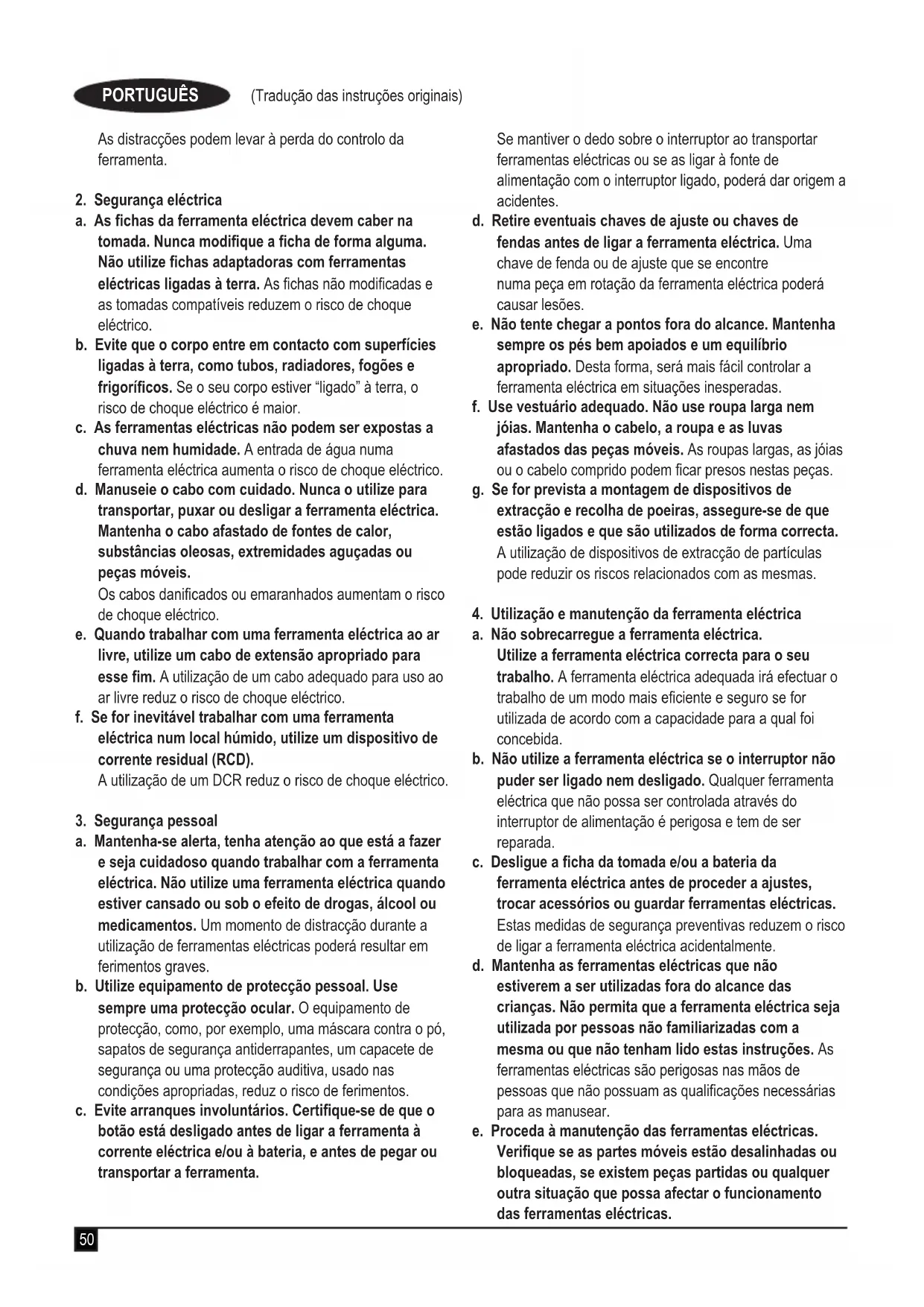 a. Mantenha a área de trabalho limpa e bem iluminada. As áreas desorganizadas ou escuras são propensas a acidentes. b. Não trabalhe com ferramentas eléctricas em áreas com risco de explosão, nas quais se encontrem líquidos, gases ou poeiras inamáveis. As ferramentas eléctricas criam faíscas que poderão inamar estas poeiras ou vapores. c. Mantenha crianças e outras pessoas afastadas durante a utilização da ferramenta eléctrica.50 (Tradução das instruções originais) PORTUGUÊS As distracções podem levar à perda do controlo da ferramenta.