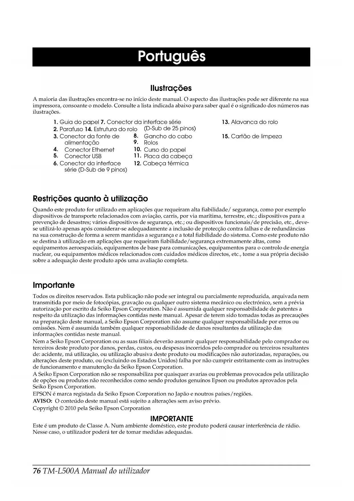 English Português Ilustrações A maioria das ilustrações encontra-se no início deste manual. O aspecto das ilustrações pode ser diferente na sua impressora, consoante o modelo. Consulte a lista indicada abaixo para saber qual é o significado dos números nas ilustrações. Restrições quanto à utilização Quando este produto for utilizado em aplicações que requeiram alta fiabilidade/ segurança, como por exemplo dispositivos de transporte relacionados com aviação, carris, por via marítima, terrestre, etc.; dispositivos para a prevenção de desastres; vários dispositivos de segurança, etc.; ou dispositivos funcionais/de precisão, etc., deve- se utilizá-lo apenas após considerar-se adequadamente a inclusão de protecção contra falhas e de redundâncias na sua construção de forma a serem mantidas a segurança e a total fiabilidade do sistema. Como este produto não se destina à utilização em aplicações que requeiram fiabilidade/segurança extremamente altas, como equipamentos aeroespaciais, equipamentos de base para comunicações, equipamentos para o controlo de energia nuclear, ou equipamentos médicos relacionados com cuidados médicos directos, etc., tome a sua própria decisão sobre a adequação deste produto após uma avaliação completa. Importante Todos os direitos reservados. Esta publicação não pode ser integral ou parcialmente reproduzida, arquivada nem transmitida por meio de fotocópias, gravação ou qualquer outro sistema mecânico ou electrónico, sem a prévia autorização por escrito da Seiko Epson Corporation. Não é assumida qualquer responsabilidade de patentes a respeito da utilização das informações contidas neste manual. Apesar de terem sido tomadas todas as precauções na preparação deste manual, a Seiko Epson Corporation não assume qualquer responsabilidade por erros ou omissões. Nem é assumida também qualquer responsabilidade de danos resultantes da utilização das informações contidas neste manual. Nem a Seiko Epson Corporation ou as suas filiais deverão assumir qualquer responsabilidade pelo comprador ou terceiros deste produto por danos, perdas, custos, ou despesas incorridos pelo comprador ou terceiros resultantes de: acidente, má utilização, ou utilização abusiva deste produto ou modificações não autorizadas, reparações, ou alterações deste produto, ou (excluindo os Estados Unidos) falha por não cumprir estritamente com as instruções de funcionamento e manutenção da Seiko Epson Corporation. A Seiko Epson Corporation não se responsabiliza por quaisquer avarias ou problemas provocados pela utilização de opções ou produtos não reconhecidos como sendo produtos genuínos Epson ou produtos aprovados pela Seiko Epson Corporation. EPSON é marca registada da Seiko Epson Corporation no Japão e noutros países/regiões. AV I S O : O conteúdo deste manual está sujeito a alterações sem aviso prévio. Copyright © 2010 pela Seiko Epson Corporation IMPORTANTE Este é um produto de Classe A. Num ambiente doméstico, este produto poderá causar interferência de rádio. Nesse caso, o utilizador poderá ter de tomar medidas adequadas.
