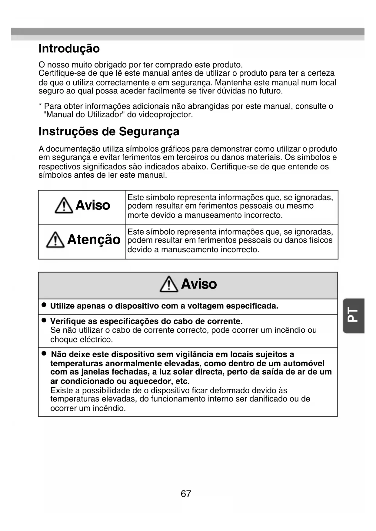 Introdução O nosso muito obrigado por ter comprado este produto.Certifique-se de que lê este manual antes de utilizar o produto para ter a certeza de que o utiliza correctamente e em segurança. Mantenha este manual num local seguro ao qual possa aceder facilmente se tiver dúvidas no futuro.* Para obter informações adicionais não abrangidas por este manual, consulte o "Manual do Utilizador" do videoprojector. Instruções de Segurança A documentação utiliza símbolos gráficos para demonstrar como utilizar o produto em segurança e evitar ferimentos em terceiros ou danos materiais. Os símbolos e respectivos significados são indicados abaixo. Certifique-se de que entende os símbolos antes de ler este manual. Aviso Este símbolo representa informações que, se ignoradas, podem resultar em ferimentos pessoais ou mesmo morte devido a manuseamento incorrecto. Atenção Este símbolo representa informações que, se ignoradas, podem resultar em ferimentos pessoais ou danos físicos devido a manuseamento incorrecto. Aviso