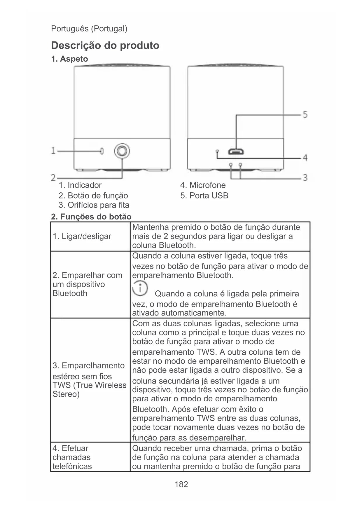 chamadas telefónicas Quando receber uma chamada, prima o botão de função na coluna para atender a chamada ou mantenha premido o botão de função paraPortuguês (Portugal)