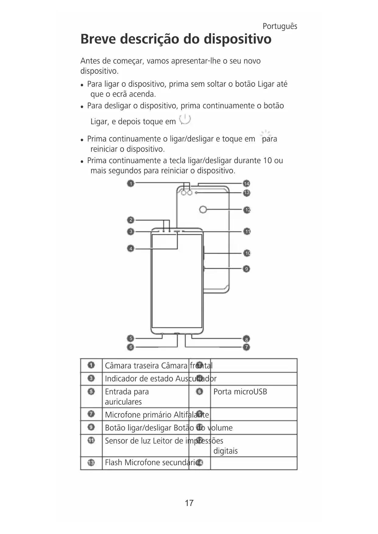 UNIQUEMENT. IL NE CONSTITUE EN AUCUN CAS UNE FORME DE GARANTIE. 16Breve descrição do dispositivo Antes de começar, vamos apresentar-lhe o seu novo dispositivo. l Para ligar o dispositivo, prima sem soltar o botão Ligar até que o ecrã acenda. l Para desligar o dispositivo, prima continuamente o botão Ligar, e depois toque em . l Prima continuamente o ligar/desligar e toque em para reiniciar o dispositivo. l Prima continuamente a tecla ligar/desligar durante 10 ou mais segundos para reiniciar o dispositivo.