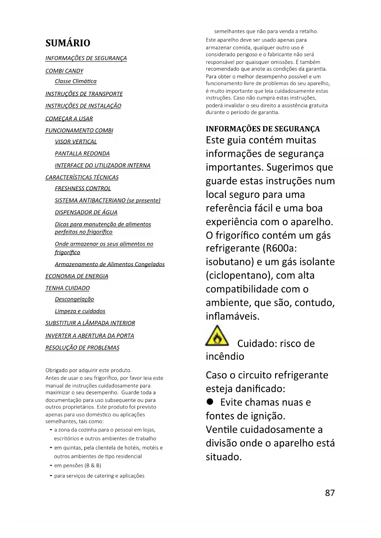 Thermostate, Temperatursensoren, Leiterplatten und Lichtquellen sind nach dem Inverkehrbringen der letzten Einheit des Modells mindestens sieben Jahre lang verfügbar. Türgriffe, Türscharniere, Tabletts und Körbe für einen Zeitraum von mindestens sieben Jahren und Türdichtungen für einen Zeitraum von mindestens zehn Jahren, nachdem die letzte Einheit des Modells auf den Markt gebracht wurde Weitere Informationen zum Produkt erhalten Sie unter https://eprel.ec.europa.eu/ oder scannen Sie den QR auf dem mit dem Gerät gelieferten Energieetikett87 Portuguese SUMÁRIO INFORMAÇÕES DE SEGURANÇA COMBI CANDY Classe Climática INSTRUÇÕES DE TRANSPORTE INSTRUÇÕES DE INSTALAÇÃO COMEÇAR A USAR FUNCIONAMENTO COMBI VISOR VERTICAL PANTALLA REDONDA INTERFACE DO UTILIZADOR INTERNA CARACTERÍSTICAS TÉCNICAS FRESHNESS CONTROL SISTEMA ANTIBACTERIANO (se presente) DISPENSADOR DE ÁGUA Dicas para manutenção de alimentos perfeitos no frigorífico Onde armazenar os seus alimentos no frigorífico Armazenamento de Alimentos Congelados ECONOMIA DE ENERGIA TENHA CUIDADO Descongelação Limpeza e cuidados SUBSTITUIR A LÂMPADA INTERIOR INVERTER A ABERTURA DA PORTA RESOLUÇÃO DE PROBLEMAS Obrigado por adquirir este produto. Antes de usar o seu frigorífico, por favor leia este manual de instruções cuidadosamente para maximizar o seu desempenho. Guarde toda a documentação para uso subsequente ou para outros proprietários. Este produto foi previsto apenas para uso doméstico ou aplicações semelhantes, tais como: - a zona da cozinha para o pessoal em lojas, escritórios e outros ambientes de trabalho - em quintas, pela clientela de hotéis, motéis e outros ambientes de tipo residencial - em pensões (B & B) - para serviços de catering e aplicações semelhantes que não para venda a retalho. Este aparelho deve ser usado apenas para armazenar comida, qualquer outro uso é considerado perigoso e o fabricante não será responsável por quaisquer omissões. É também recomendado que anote as condições da garantia. Para obter o melhor desempenho possível e um funcionamento livre de problemas do seu aparelho, é muito importante que leia cuidadosamente estas instruções. Caso não cumpra estas instruções, poderá invalidar o seu direito a assistência gratuita durante o período de garantia.
