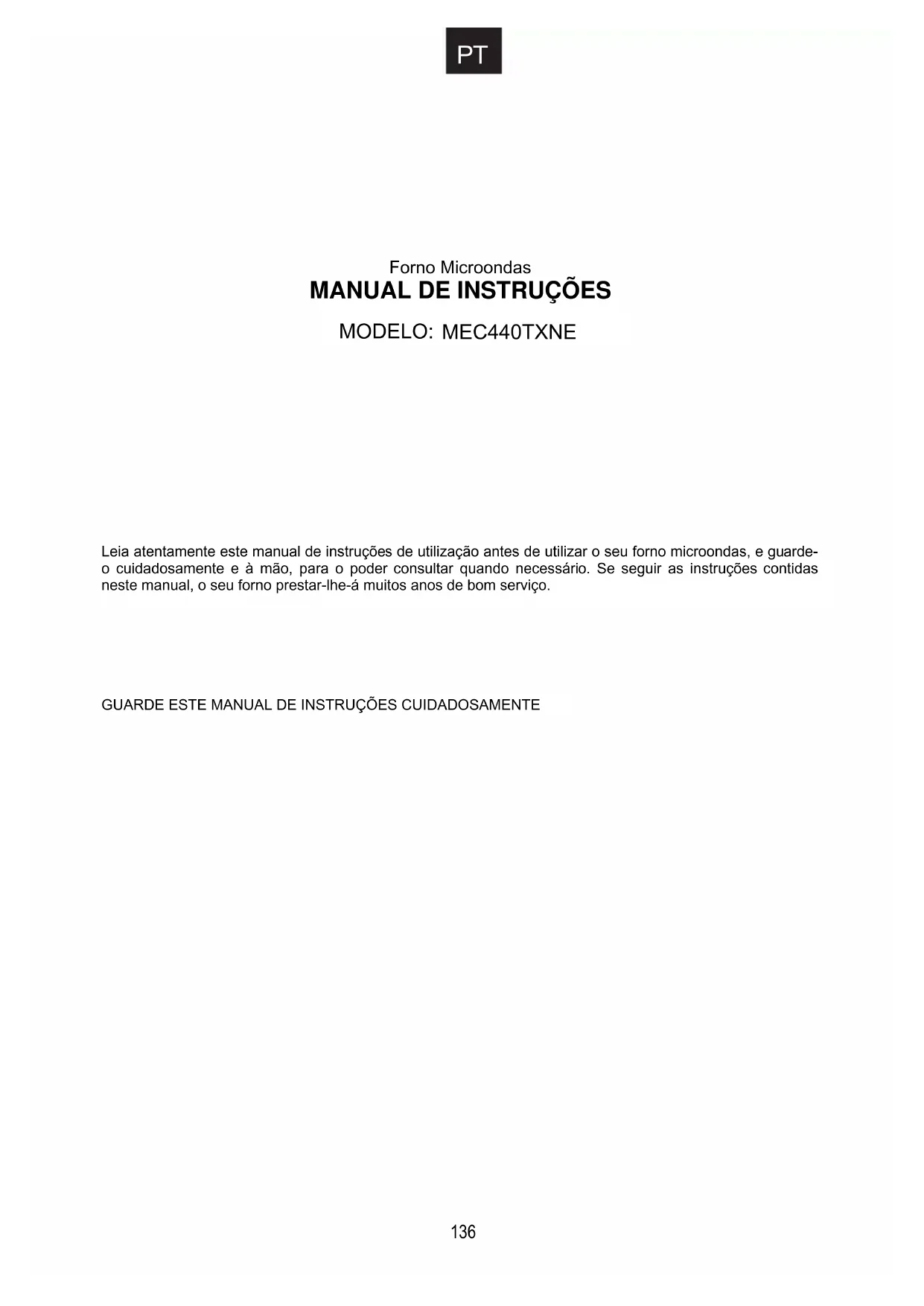 Leia atentamente este manual de instruções de utilização antes de utilizar o seu forno microondas, e guarde- o cuidadosamente e à mão, para o poder consultar quando necessário. Se seguir as instruções contidas neste manual, o seu forno prestar-lhe-á muitos anos de bom serviço.