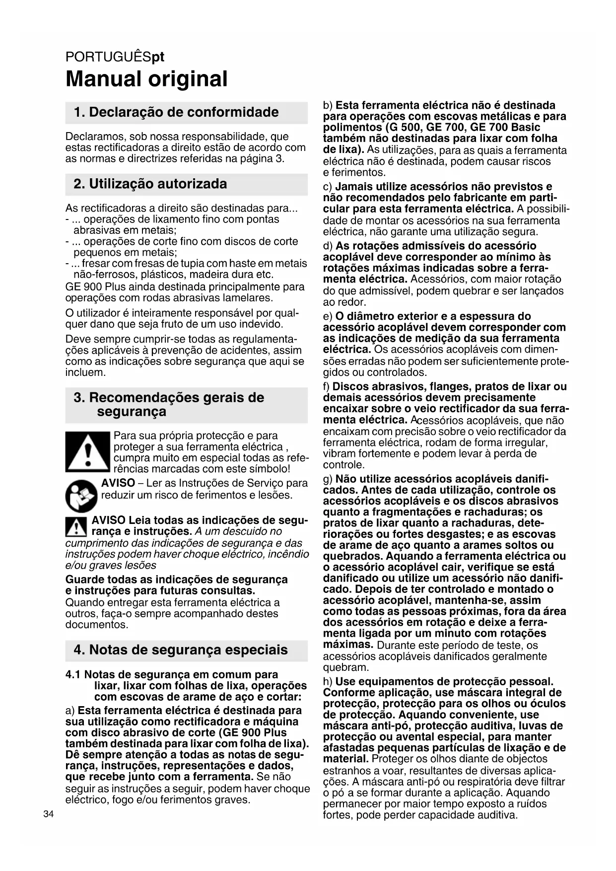 AVISO – Utilize sempre um óculos de protecção. Use bases de amortecimento el ásticas, quando estas forem colocadas à disposição junto com o abrasivo e quando forem requeridas. Observar as indicações do fabricante da ferra- menta ou do acessório! Proteger os discos diante de g raxa e impactos! Guardar e manusear os abrasivos com todo o cuida do e conforme instruções do fabricante. Jamais use os discos abrasivos de corte para reb arbar! Os discos abrasivos de corte não devem ser submetidos a uma pressão lateral. A peça a trabalhar deve ficar bem apoiada e ser protegida contra deslizes, p .ex. através de dispositivos de fixação. Peças maiores tem de ser apoiadas suficientemente. Accione o bloqueio do veio (6) somente quando o motor está parado. (GE 700, GE 900 Plus) Não pegar na ferramenta em rotação! Remover apa ras e semelhantes apenas quando a máquina estiver parada. Providencie para que o meio lixador seja colocado e fix ado correctamente antes da sua utilização e deixe funcionar a ferramenta na marcha em vazio por 30 segundos em uma posição segura; pare imediatamente quando aparecerem grandes oscilações ou quando constatar outros defeitos. Ocor rendo esta situação, verifique a máquina para apurar a causa. Certifique-se de que as faíscas produzidas durante a utili zação não originam nenhum perigo, p. ex. atingir o utilizador ou outras pessoas ou incendiar substâncias inflamáveis. As áreas expostas ao perigo de incêndio devem ser protegidas com coberturas ignífugas. Tenha sempre um extintor pronto a ser utilizado nas áreas expostas ao perigo de incêndio. Os pós de materiais como revestimentos que