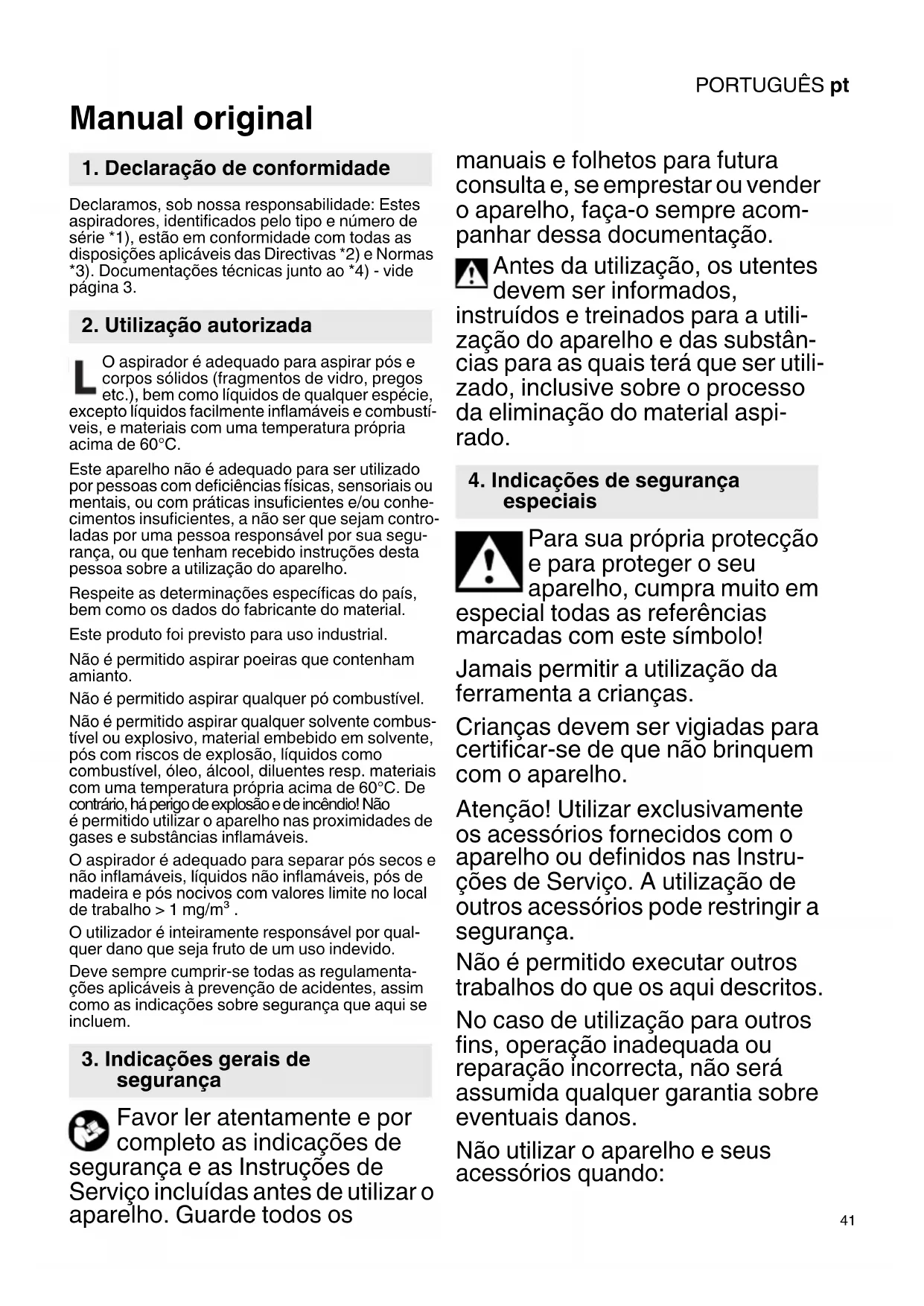 Manual original Declaramos, sob nossa responsabilidade: Estes aspiradores, identificados pelo tipo e número de série *1), estão em conformidade com todas as disposições aplicáveis das Directivas *2) e Normas *3). Documentações técnicas junto ao *4) - vide página 3. O aspirador é adequado para aspirar pós e corpos sólidos (fragmentos de vidro, pregos etc.), bem como líquidos de qualquer espécie, excepto líquidos facilmente inflamáveis e combustí- veis, e materiais com uma temperatura própria acima de 60°C. Este aparelho não é adequado para ser utilizado por pessoas com deficiências físicas, sensoriais ou mentais, ou com práticas insuficientes e/ou conhe- cimentos insuficientes, a não ser que sejam contro- ladas por uma pessoa responsável por sua segu- rança, ou que tenham recebido instruções desta pessoa sobre a utilização do aparelho. Respeite as determinações específicas do país, bem como os dados do fabricante do material. Este produto foi previsto para uso industrial. Não é permitido aspirar poeiras que contenham amianto. Não é permitido aspirar qualquer pó combustível. Não é permitido aspirar qualquer solvente combus- tível ou explosivo, material embebido em solvente, pós com riscos de explosão, líquidos como combustível, óleo, álcool, diluentes resp. materiais com uma temperatura própria acima de 60°C. De contrário, há perigo de explosão e de incêndio! Não é permitido utilizar o aparelho nas proximidades de gases e substâncias inflamáveis. O aspirador é adequado para separar pós secos e não inflamáveis, líquidos não inflamáveis, pós de madeira e pós nocivos com valores limite no local de trabalho > 1 mg/m³ . O utilizador é inteiramente responsável por qual- quer dano que seja fruto de um uso indevido. Deve sempre cumprir-se todas as regulamenta- ções aplicáveis à prevenção de acidentes, assim como as indicações sobre segurança que aqui se incluem. Favor ler atentamente e por completo as indicações de segurança e as Instruções de Serviço incluídas antes de utilizar o aparelho. Guarde todos os manuais e folhetos para futura consulta e, se emprestar ou vender o aparelho, faça-o sempre acom- panhar dessa documentação. Antes da utilização, os utentes devem ser informados, instruídos e treinados para a utili- zação do aparelho e das substân- cias para as quais terá que ser utili- zado, inclusive sobre o processo da eliminação do material aspi- rado. Para sua própria protecção e para proteger o seu aparelho, cumpra muito em especial todas as referências marcadas com este símbolo! Jamais permitir a utilização da ferramenta a crianças. Crianças devem ser vigiadas para certificar-se de que não brinquem com o aparelho. Atenção! Utilizar exclusivamente os acessórios fornecidos com o aparelho ou definidos nas Instru- ções de Serviço. A utilização de outros acessórios pode restringir a segurança. Não é permitido executar outros trabalhos do que os aqui descritos. No caso de utilização para outros fins, operação inadequada ou reparação incorrecta, não será assumida qualquer garantia sobre eventuais danos. Não utilizar o aparelho e seus acessórios quando: