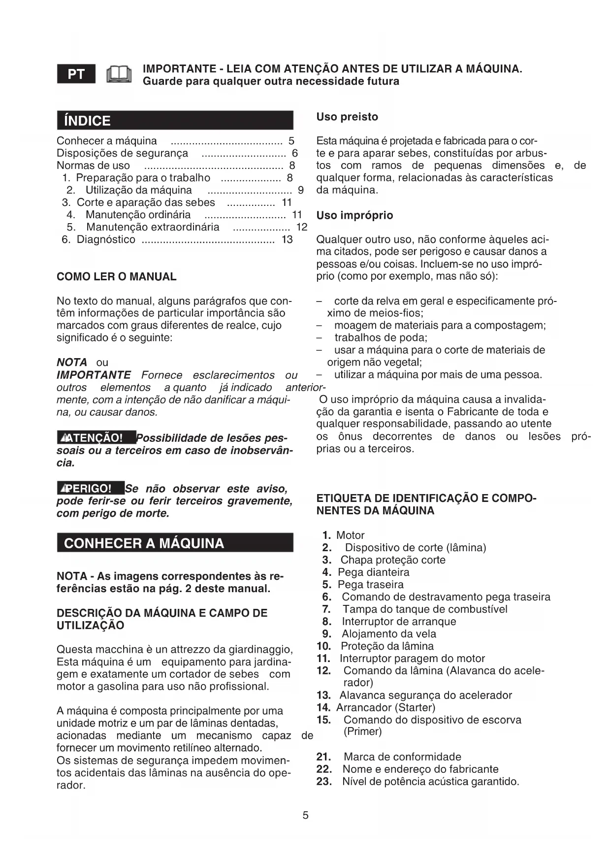 IMPORTANTE - LEIA COM ATENÇÃO ANTES DE UTILIZAR A MÁQUINA. Guarde para qualquer outra necessidade futura Uso preisto Esta máquina é projetada e fabricada para o cor- te e para aparar sebes, constituídas por arbus- tos com ramos de pequenas dimensões e, de qualquer forma, relacionadas às características da máquina. Uso impróprio Qualquer outro uso, não conforme àqueles aci- ma citados, pode ser perigoso e causar danos a pessoas e/ou coisas. Incluem-se no uso impró- prio (como por exemplo, mas não só): – corte da relva em geral e especicamente pró- ximo de meios-os; – moagem de materiais para a compostagem; – trabalhos de poda; – usar a máquina para o corte de materiais de origem não vegetal; – utilizar a máquina por mais de uma pessoa. O uso impróprio da máquina causa a invalida- ção da garantia e isenta o Fabricante de toda e qualquer responsabilidade, passando ao utente os ônus decorrentes de danos ou lesões pró- prias ou a terceiros.