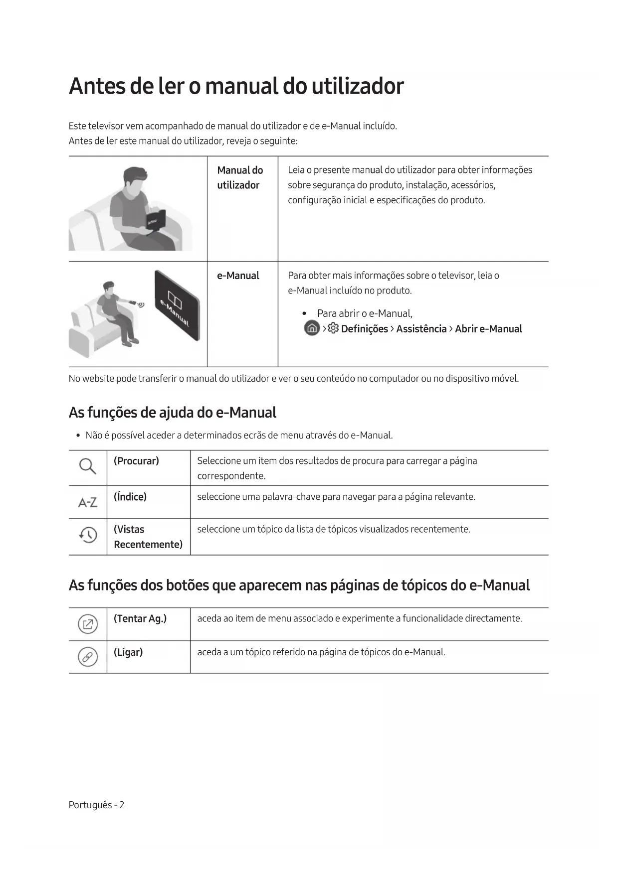 - Para abrir o e-Manual, > Denições > Assistência > Abrir e-Manual No website pode transferir o manual do utilizador e ver o seu conteúdo no computador ou no dispositivo móvel. As funções de ajuda do e-Manual