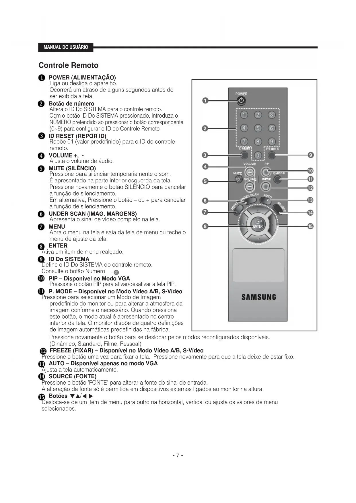 Pressione novamente o botão para se deslocar pelos modos reconfigurados disponíveis. (Dinâmico, Standard, Filme, Pessoal) FREEZE (FIXAR) – Disponível no Modo Vídeo A/B, S-Vídeo Pressione o botão uma vez para fixar a tela. Pressione novamente para que a tela deixe de estar fixo. AUTO – Disponível apenas no modo VGA Ajusta a tela automaticamente. SOURCE (FONTE) Pressione o botão 'FONTE' para alterar a fonte do sinal de entrada. A alteração da fonte só é permitida em dispositivos externos ligados ao monitor na altura. Botões