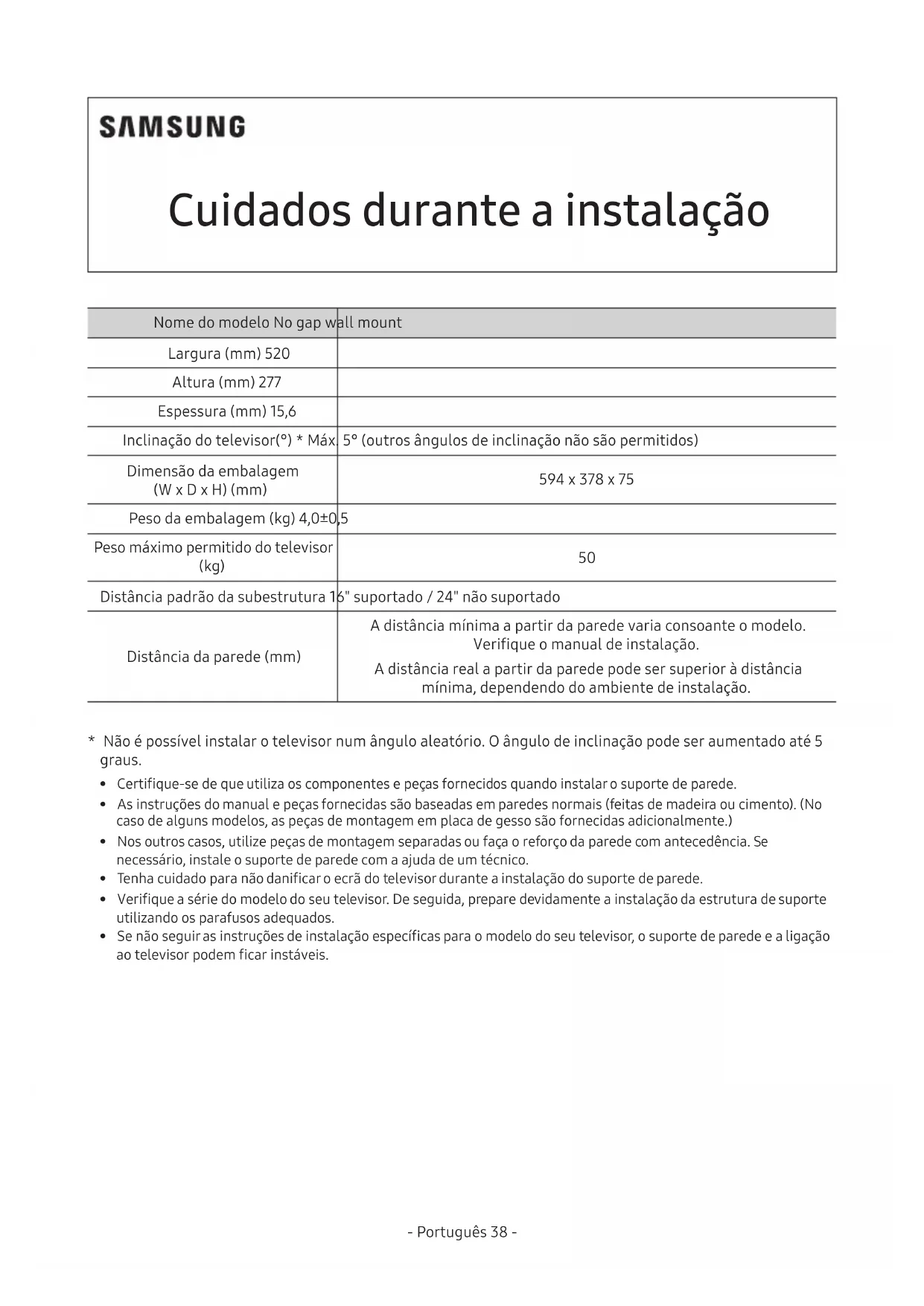- Para assegurar um bom desempenho e evitar avarias do produto, não o instale nos seguintes locais: – Sítios onde possam ocorrer vibrações ou impactos, porque o produto pode cair e car danicado. – Junto a um sensor de aspersor de incêndio, porque o sensor pode detectar o calor do televisor e ligar o aspersor. – Próximo de cabos de alta pressão, porque o televisor pode sofrer interferências dos cabos e a imagem ser afectada. – Próximo de aquecedores, porque o televisor pode sobreaquecer e avariar. – Não instale noutro sítio que não numa parede vertical. – Instale-o num local fora do alcance das crianças. – Não fure a parede para o instalar no seu interior. – Não se esqueça de vericar o tipo e o estado da parede onde vai fazer a instalação. – Os materiais a usar podem variar consoante o tipo de parede. Escolha os materiais com base nas especicações abaixo indicadas. – Não necessita de utilizar todos os parafusos fornecidos. No entanto, tem de utilizar pelo menos quatro parafusos. – Tem de utilizar parafusos nos dois locais com a indicação A. – Escolha pelo menos duas das peças com a indicação B para a montagem, consoante o que está em redor. – Para esconder os cabos no interior da parede, contacte um técnico de instalação especializado.- Português 44 - - Português 45 - Cuidados ao instalar Nome do modelo No gap wall mount Largura (mm) 520 Altura (mm) 277 Espessura (mm) 15.6 Inclinação (°) da TV * Máx. 5° (não são permitidos outros ângulos de inclinação) Tamanho da embalagem (L x P x A) (mm) 594 x 378 x 75 Peso da embalagem (kg) 4.0±0.5 Peso máx. permitido da TV (kg) 50 Distância padrão de viga 16" compatível / 24" não compatível Espaço da parede (mm) O espaço mínimo a partir da parede varia, dependendo do modelo. Verique o manual de instalação. O espaço real a partir da parede pode ser maior que o espaço mínimo, dependendo do ambiente de instalação.