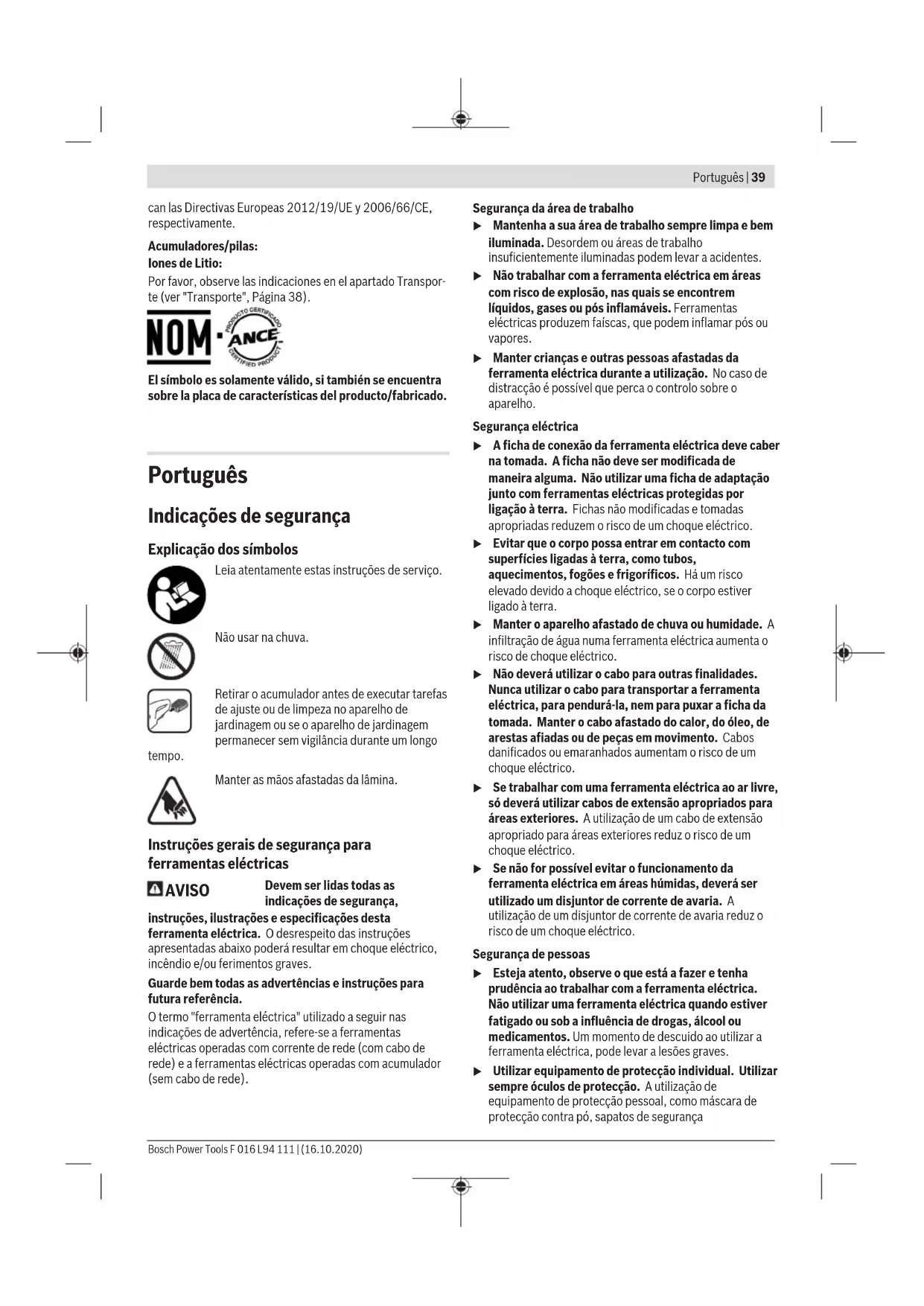 Declaração de Conformidade UE Declaramos sob nossa exclusiva responsabilidade que os produ- tos mencionados cumprem todas as disposições e os regulamen- tos indicados e estão em conformidade com as seguintes nor- mas. Tesoura de sebes sem fio N.° do produto
