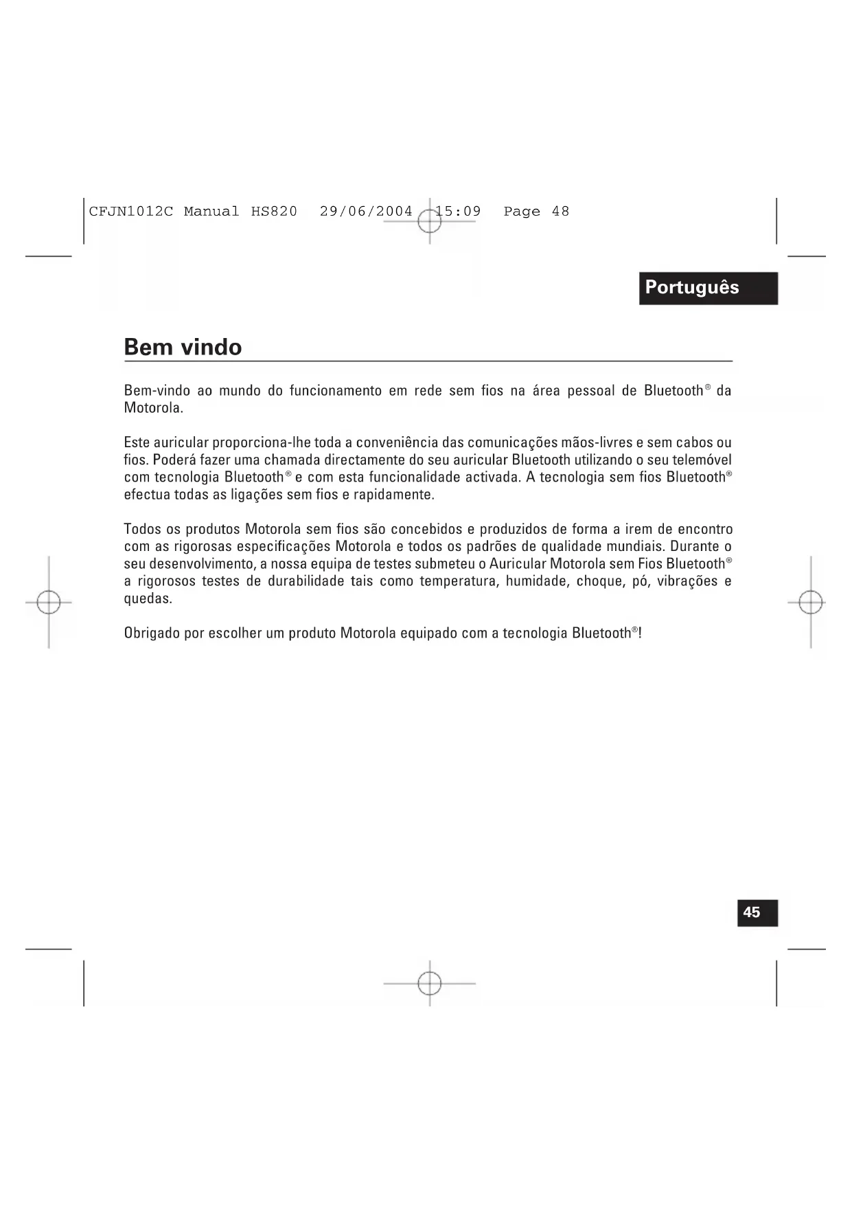 Nederlands CFJN1012C Manual HS820 29/06/2004 15:09 Page 4745 Bem vindo Bem-vindo ao mundo do funcionamento em rede sem fios na área pessoal de Bluetooth