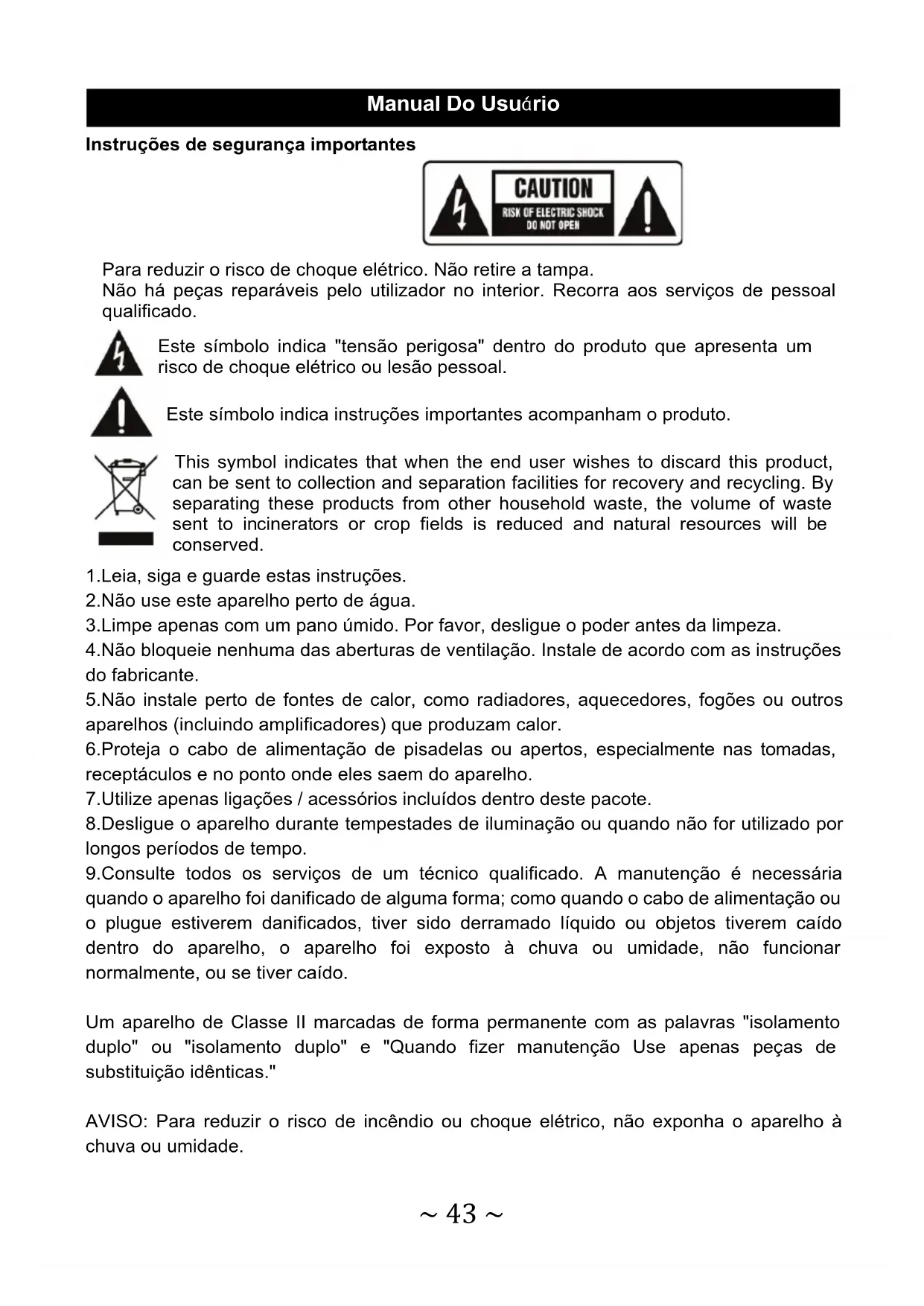 Leia o manual com atenção antes de utilizar Portuguese~ 43 ~ Para reduzir o risco de choque elétrico. Não retire a tampa. Não há peças reparáveis pelo utilizador no interior. Recorra aos serviços de pessoal qualificado. Este símbolo indica "tensão perigosa" dentro do produto que apresenta um risco de choque elétrico ou lesão pessoal. Este símbolo indica instruções importantes acompanham o produto. This symbol indicates that when the end user wishes to discard this product, can be sent to collection and separation facilities for recovery and recycling. By separating these products from other household waste, the volume of waste sent to incinerators or crop fields is reduced and natural resources will be conserved. Manual Do Usuário