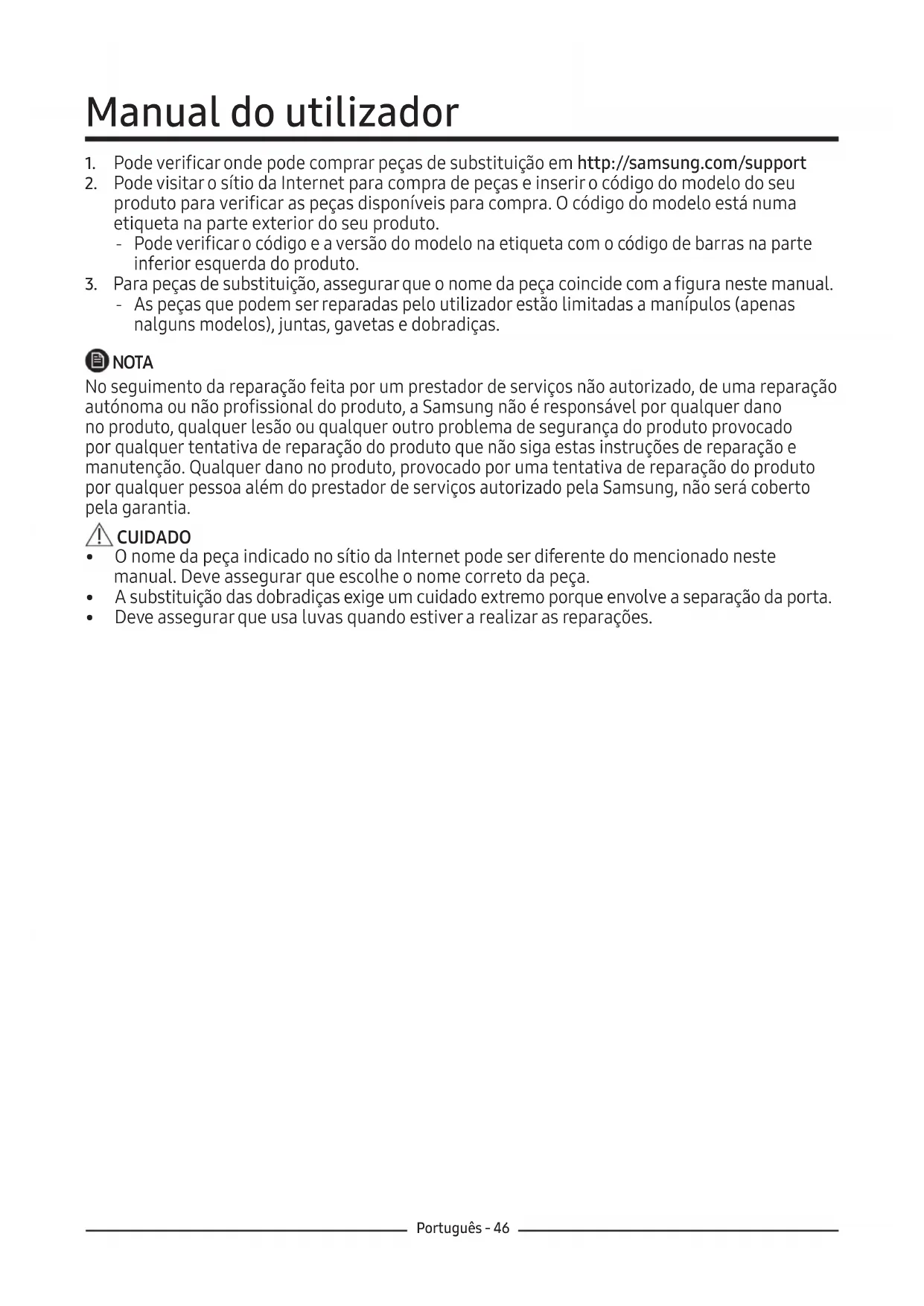 ‐ As peças que podem ser reparadas pelo utilizador estão limitadas a manípulos (apenas nalguns modelos), juntas, gavetas e dobradiças. NOTA No seguimento da reparação feita por um prestador de serviços não autorizado, de uma reparação autónoma ou não profissional do produto, a Samsung não é responsável por qualquer dano no produto, qualquer lesão ou qualquer outro problema de segurança do produto provocado por qualquer tentativa de reparação do produto que não siga estas instruções de reparação e manutenção. Qualquer dano no produto, provocado por uma tentativa de reparação do produto por qualquer pessoa além do prestador de serviços autorizado pela Samsung, não será coberto pela garantia. CUIDADO
