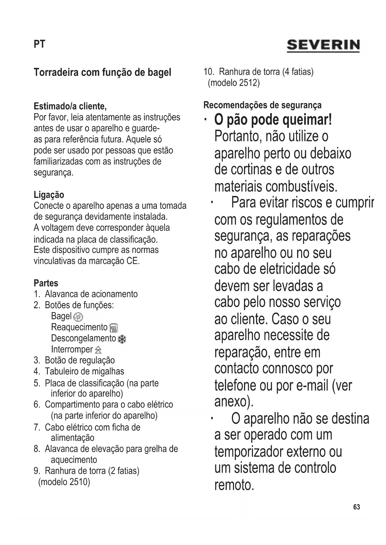 de idade ou mais e sejam supervisionadas. ∙ Crianças menores de 8 anos devem ser mantidas longe do aparelho e do respetivo cabo elétrico. ∙ Embalagens não são brinquedos para crianças. Existe risco de asxia! ∙ Coloque o aparelho sobre uma superfície plana e resistente ao calor. ∙ Não coloque ou utilize o aparelho sobre superfícies quentes (ex., fogões) ou perto de chamas de gás, para evitar danos ao corpo da torradeira e ao cabo de alimentação. ∙ Não faça funcionar nem guarde o aparelho no exterior. ∙ Cuidado! as superfícies exteriores cam quentes durante a utilização e permanecerão quentes por algum tempo. Risco de queimaduras! ∙ Antes de iniciar o aparelho, verique se falta algo no seu corpo ou algum acessório que possa comprometer a segurança do mesmo. Por exemplo, se o aparelho sofreu o impacto de uma queda, pode haver danos que não consiga ver a partir do exterior. Se este for o caso, não utilize o aparelho. ∙ Desenrole completamente o cabo elétrico antes da utilização. ∙ O cabo elétrico não deve tocar nas partes quentes do aparelho. ∙ Não deixe o cabo elétrico pendurado. ∙ Nunca deixe o aparelho ligado sem supervisão. ∙ Nunca tape as ranhuras de torra quando estiver a usá-las. ∙ Nunca coloque o pão diretamente sobre as ranhuras de torra. ∙ Cuidado! Não torre fatias de pão por cima da grelha. Isto pode danicar o aparelho. ∙ Nunca tente extrair itens das ranhuras de torra com os dedos ou com objetos (por exemplo, garfos, facas ou outros), pois o contacto com as resistências pode resultar em eletrocussão. ∙ Desligue o cabo de alimentação: - depois de cada uso; - em caso de falhas durante o funcionamento; - antes de cada limpeza do aparelho. ∙ Não desligue a cha da tomada puxando o cabo elétrico, mas sim segurando a própria cha. ∙ Não insira a cha com as mãos molhadas. ∙ Se o aparelho for operado incorretamente ou para um m que não o recomendado, nenhuma responsabilidade será assumida por qualquer dano que possa ocorrer. Utilização adequada ∙ Este aparelho destina-se apenas a torrar fatias individuais de pão ou bagels nas ranhuras de torra e aquecer pãezinhos na grelha de aquecimento. ∙ Não pode tentar inserir várias fatias de pão numa só ranhura nem gratinar outros alimentos. ∙ Alimentos com recheio ou cobertura, como manteiga ou geleia, não podem ser torrados.66 104 x 142 mm ∙ Este aparelho só pode ser utilizado com os acessórios fornecidos pelo fabricante. ∙ Qualquer outro uso não mencionado nas instruções é considerado impróprio e pode resultar em ferimentos graves ou danos no aparelho. Instruções Informações gerais ∙ Cuidado: a alavanca de acionamento só se encaixa quando a torradeira estiver ligada à tomada! ∙ Não use fatias muito grossas nem muito grandes, pois estas podem car presas facilmente. Pode torrar metades de bagel com espessura até 25 mm. ∙ Em caso de falha ou de limpeza, desligue primeiro a cha da tomada! ∙ Fatias presas devem ser soltas com um bastão de madeira sem ponta (por exemplo, o cabo de um pincel). Ao fazê- lo, não toque nas resistências. Antes de utilizar pela primeira vez ∙ Limpe a torradeira (veja Limpeza e manutenção). ∙ Opere a torradeira sem pães pelo menos cinco vezes no nível máximo do botão de regulação. ∙ Deixe a torradeira arrefecer entre desligar e ligar. ∙ É possível que surja um leve cheiro (ou ainda um pequeno nível de fumo) que se dispersará após um curto período de tempo. Assegure-se de que há ventilação adequada através de janelas ou portas abertas. Desligamento automático O aparelho está equipado com desligamento automático. O aparelho é desligado se, após o término do processo de torra, uma fatia torrada estiver bloqueada e não puder ser ejetada das ranhuras de torra. Desligue, então, a cha de alimentação e retire a torrada conforme descrito em Informações gerais. Seleção do nível de torra ∙ O grau desejado de torra pode ser ajustado no botão de regulação. Torra reduzida (claro): gire o botão de regulação para a esquerda. Torra intensa (escuro): gire o botão de regulação para a direita. ∙ Para pão de forma, recomendamos denir o grau de torra para a posição 4. Conselho: Modelo 2512: Para obter um alourado uniforme ao torrar apenas duas fatias, deve utilizar ambas as ranhuras, com o controlo de torra mais para a esquerda. Modo de utilização ∙ Ligue a cha do cabo elétrico à tomada. ∙ Após denir o grau desejado de torra, coloque o pão na ranhura de torra e pressione a alavanca de acionamento para baixo. ∙ A luz do botão de cancelamento ( ) acenderá. ∙ Quando o nível de torra denido é atingido, a torradeira é desligada automaticamente e as fatias de pão são ejetadas. A luz do botão de104 x 142 mm