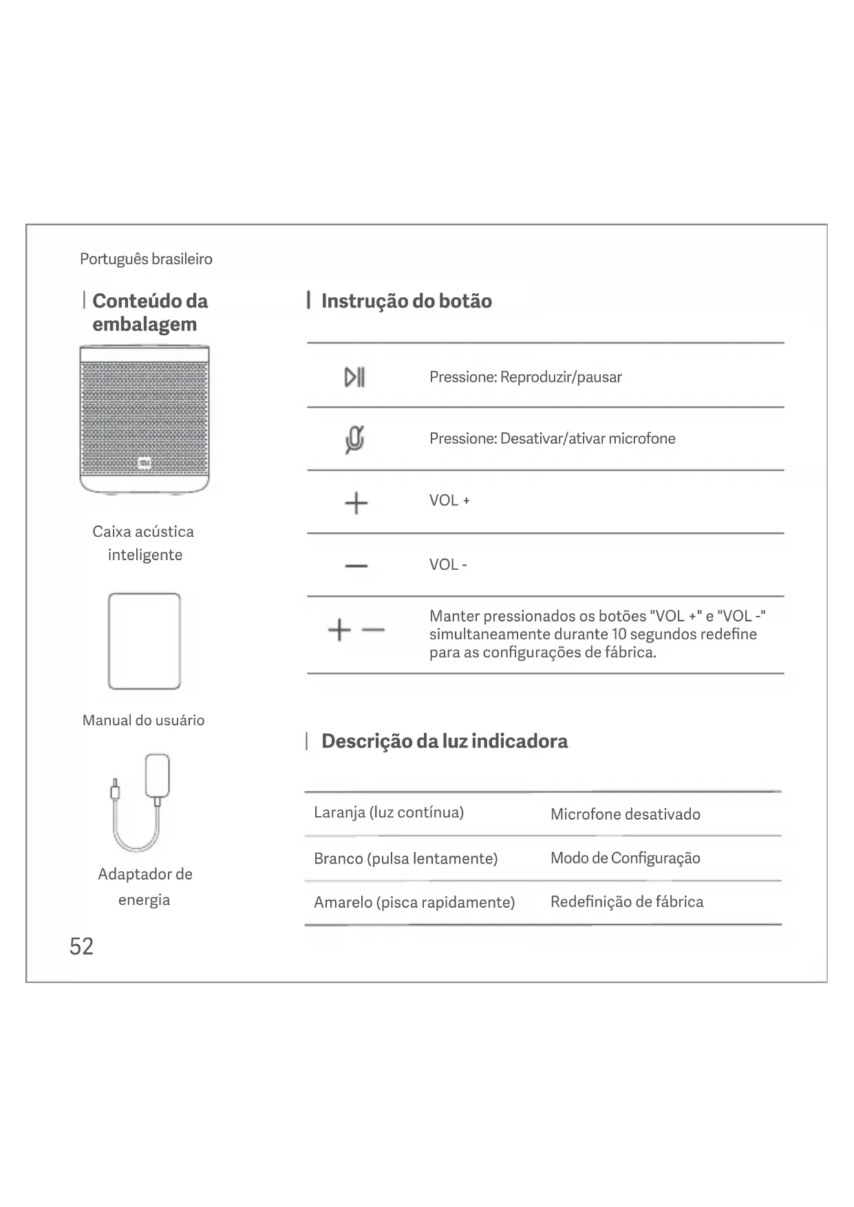 Versión del manual del usuario: V5.0 Google, Android, Google Play y Google Home son marcas de Google LLC. Google Assistant no está disponible en determinados idiomas y países.52 Adaptador de energia Manual do usuário Caixa acústica inteligente Conteúdo da embalagem Instrução do botão Pressione: Reproduzir/pausar Pressione: Desativar/ativar microfone Manter pressionados os botões "VOL +" e "VOL -" simultaneamente durante 10 segundos redefine para as configurações de fábrica. VOL + VOL - Português brasileiro Laranja (luz contínua) Branco (pulsa lentamente) Amarelo (pisca rapidamente) Descrição da luz indicadora Microfone desativado Modo de Configuração Redefinição de fábrica53 Seu Mi Smart Speaker. Tudo que você precisa para começar Introdução