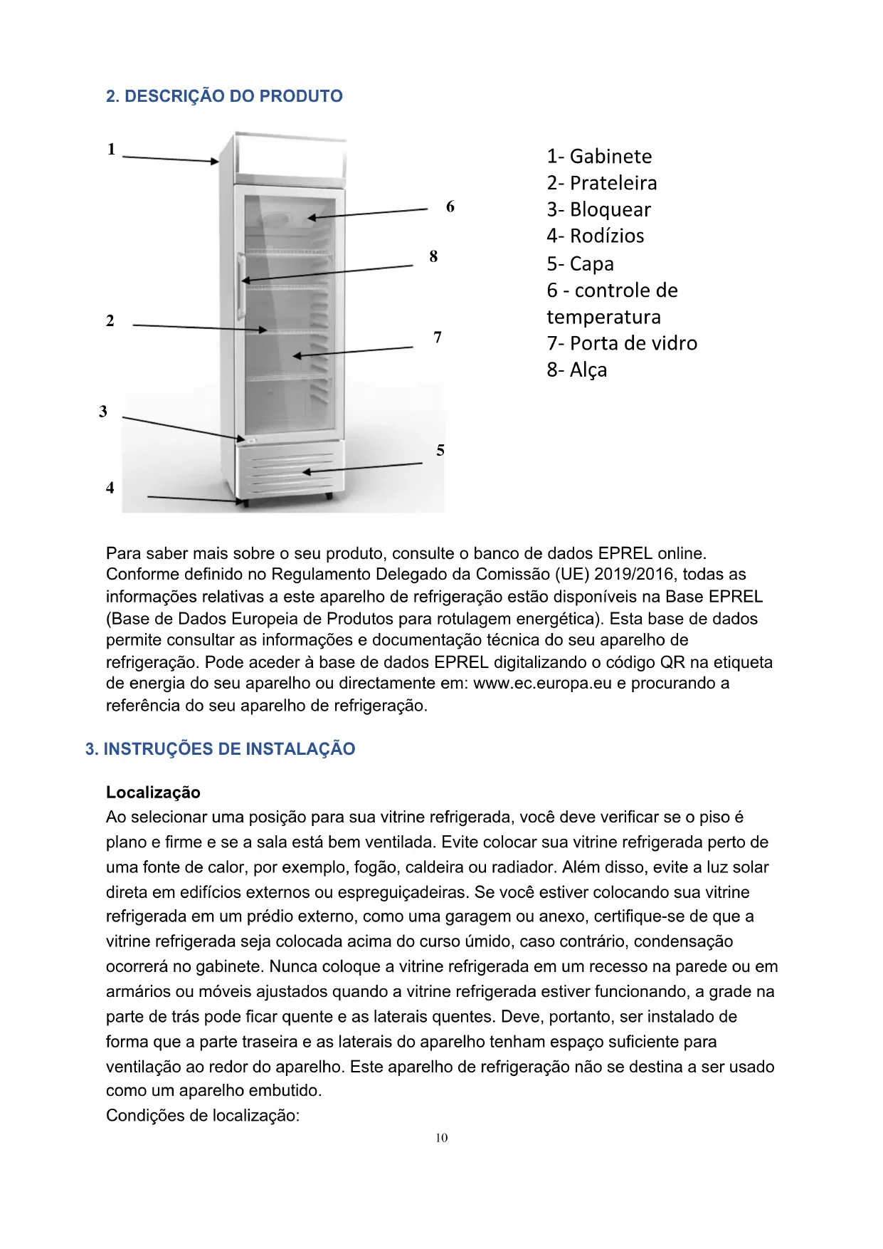 Localização Ao selecionar uma posição para sua vitrine refrigerada, você deve verificar se o piso é plano e firme e se a sala está bem ventilada. Evite colocar sua vitrine refrigerada perto de uma fonte de calor, por exemplo, fogão, caldeira ou radiador. Além disso, evite a luz solar direta em edifícios externos ou espreguiçadeiras. Se você estiver colocando sua vitrine refrigerada em um prédio externo, como uma garagem ou anexo, certifique-se de que a vitrine refrigerada seja colocada acima do curso úmido, caso contrário, condensação ocorrerá no gabinete. Nunca coloque a vitrine refrigerada em um recesso na parede ou em armários ou móveis ajustados quando a vitrine refrigerada estiver funcionando, a grade na parte de trás pode ficar quente e as laterais quentes. Deve, portanto, ser instalado de forma que a parte traseira e as laterais do aparelho tenham espaço suficiente para ventilação ao redor do aparelho. Este aparelho de refrigeração não se destina a ser usado como um aparelho embutido. Condições de localização: