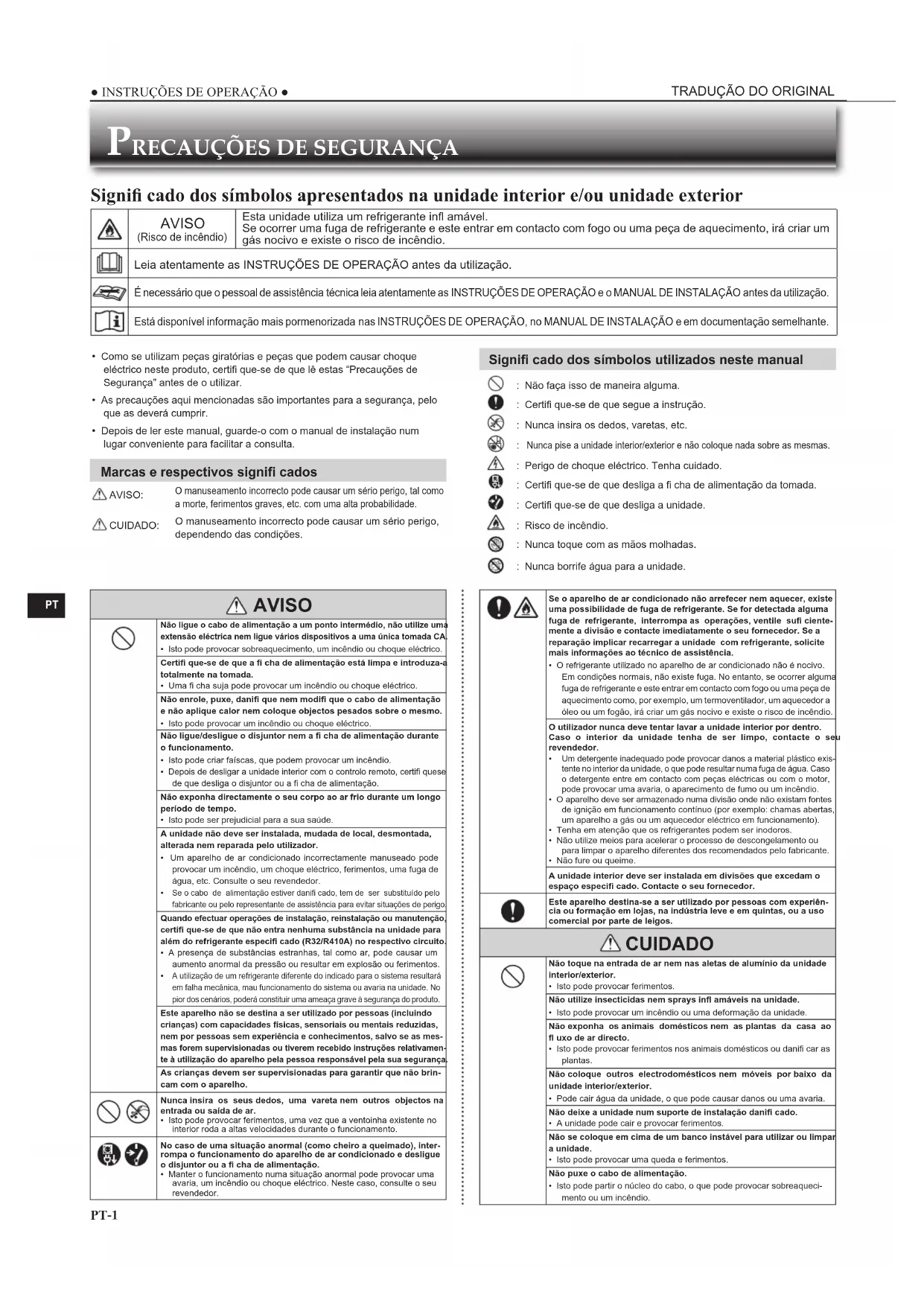 Signifi cado dos símbolos apresentados na unidade interior e/ou unidade exterior AVISO (Risco de incêndio)Esta unidade utiliza um refrigerante infl amável.Se ocorrer uma fuga de refrigerante e este entrar em contacto com fogo ou uma peça de aquecimento, irá criar um gás nocivo e existe o risco de incêndio.Leia atentamente as INSTRUÇÕES DE OPERAÇÃO antes da utilização. É necessário que o pessoal de assistência técnica leia atentamente as INSTRUÇÕES DE OPERAÇÃO e o MANUAL DE INSTALAÇÃO antes da utilização. Está disponível informação mais pormenorizada nas INSTRUÇÕES DE OPERAÇÃO, no MANUAL DE INSTALAÇÃO e em documentação semelhante. AVISO Não ligue o cabo de alimentação a um ponto intermédio, não utilize uma extensão eléctrica nem ligue vários dispositivos a uma única tomada CA.• Isto pode provocar sobreaquecimento, um incêndio ou choque eléctrico.Certifi que-se de que a fi cha de alimentação está limpa e introduza-a totalmente na tomada.• Uma fi cha suja pode provocar um incêndio ou choque eléctrico.Não enrole, puxe, danifi que nem modifi que o cabo de alimentação e não aplique calor nem coloque objectos pesados sobre o mesmo.• Isto pode provocar um incêndio ou choque eléctrico.Não ligue/desligue o disjuntor nem a fi cha de alimentação durante o funcionamento.• Isto pode criar faíscas, que podem provocar um incêndio.• Depois de desligar a unidade interior com o controlo remoto, certifi quese de que desliga o disjuntor ou a fi cha de alimentação. Não exponha directamente o seu corpo ao ar frio durante um longo período de tempo.• Isto pode ser prejudicial para a sua saúde.A unidade não deve ser instalada, mudada de local, desmontada, alterada nem reparada pelo utilizador.• Um aparelho de ar condicionado incorrectamente manuseado pode provocar um incêndio, um choque eléctrico, ferimentos, uma fuga de água, etc. Consulte o seu revendedor. Se o cabo de alimentação estiver danifi cado, tem de ser substituído pelo fabricante ou pelo representante de assistência para evitar situações de perigo.Quando efectuar operações de instalação, reinstalação ou manutenção, certifi que-se de que não entra nenhuma substância na unidade para além do refrigerante especifi cado (R32/R410A) no respectivo circuito.• A presença de substâncias estranhas, tal como ar, pode causar um aumento anormal da pressão ou resultar em explosão ou ferimentos. A utilização de um refrigerante diferente do indicado para o sistema resultará em falha mecânica, mau funcionamento do sistema ou avaria na unidade. No pior dos cenários, poderá constituir uma ameaça grave à segurança do produto.Este aparelho não se destina a ser utilizado por pessoas (incluindo crianças) com capacidades físicas, sensoriais ou mentais reduzidas, nem por pessoas sem experiência e conhecimentos, salvo se as mes-mas forem supervisionadas ou tiverem recebido instruções relativamen-te à utilização do aparelho pela pessoa responsável pela sua segurança.As crianças devem ser supervisionadas para garantir que não brin-cam com o aparelho. Nunca insira os seus dedos, uma vareta nem outros objectos na entrada ou saída de ar.• Isto pode provocar ferimentos, uma vez que a ventoinha existente no interior roda a altas velocidades durante o funcionamento. No caso de uma situação anormal (como cheiro a queimado), inter-rompa o funcionamento do aparelho de ar condicionado e desligue o disjuntor ou a fi cha de alimentação.• Manter o funcionamento numa situação anormal pode provocar uma avaria, um incêndio ou choque eléctrico. Neste caso, consulte o seu revendedor. Se o aparelho de ar condicionado não arrefecer nem aquecer, existe uma possibilidade de fuga de refrigerante. Se for detectada alguma fuga de refrigerante, interrompa as operações, ventile sufi ciente-mente a divisão e contacte imediatamente o seu fornecedor. Se a reparação implicar recarregar a unidade com refrigerante, solicite mais informações ao técnico de assistência.• O refrigerante utilizado no aparelho de ar condicionado não é nocivo. Em condições normais, não existe fuga. No entanto, se ocorrer alguma fuga de refrigerante e este entrar em contacto com fogo ou uma peça de aquecimento como, por exemplo, um termoventilador, um aquecedor a óleo ou um fogão, irá criar um gás nocivo e existe o risco de incêndio.O utilizador nunca deve tentar lavar a unidade interior por dentro. Caso o interior da unidade tenha de ser limpo, contacte o seu revendedor. Um detergente inadequado pode provocar danos a material plástico exis-tente no interior da unidade, o que pode resultar numa fuga de água. Caso o detergente entre em contacto com peças eléctricas ou com o motor, pode provocar uma avaria, o aparecimento de fumo ou um incêndio.• O aparelho deve ser armazenado numa divisão onde não existam fontes de ignição em funcionamento contínuo (por exemplo: chamas abertas, um aparelho a gás ou um aquecedor eléctrico em funcionamento).• Tenha em atenção que os refrigerantes podem ser inodoros.• Não utilize meios para acelerar o processo de descongelamento ou para limpar o aparelho diferentes dos recomendados pelo fabricante.• Não fure ou queime.A unidade interior deve ser instalada em divisões que excedam o espaço especifi cado. Contacte o seu fornecedor.Este aparelho destina-se a ser utilizado por pessoas com experiên-cia ou formação em lojas, na indústria leve e em quintas, ou a uso comercial por parte de leigos. CUIDADO Não toque na entrada de ar nem nas aletas de alumínio da unidade interior/exterior.• Isto pode provocar ferimentos.Não utilize insecticidas nem sprays infl amáveis na unidade.• Isto pode provocar um incêndio ou uma deformação da unidade.Não exponha os animais domésticos nem as plantas da casa ao fl uxo de ar directo.• Isto pode provocar ferimentos nos animais domésticos ou danifi car as plantas.Não coloq