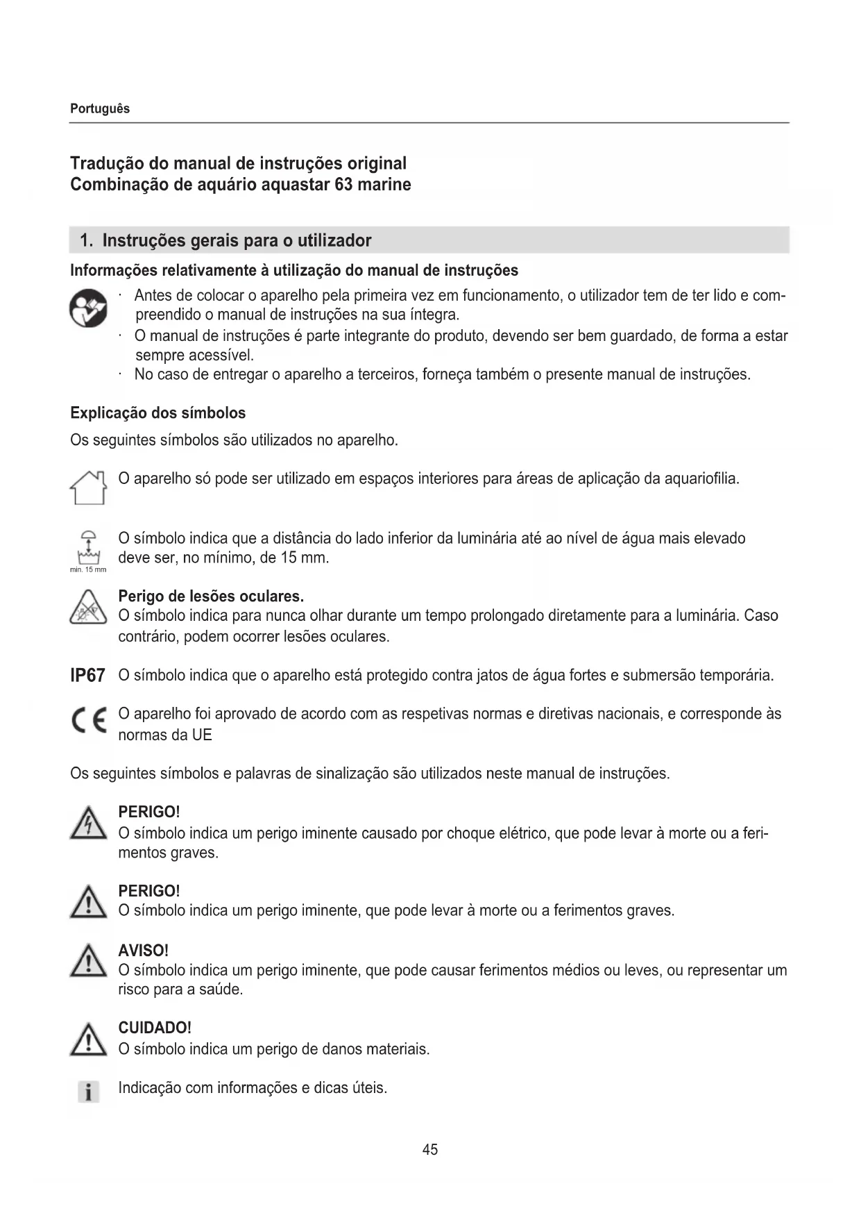 preendido o manual de instruções na sua íntegra. ‧ O manual de instruções é parte integrante do produto, devendo ser bem guardado, de forma a estar sempre acessível. ‧ No caso de entregar o aparelho a terceiros, forneça também o presente manual de instruções. Explicação dos símbolos Os seguintes símbolos são utilizados no aparelho. O aparelho só pode ser utilizado em espaços interiores para áreas de aplicação da aquariolia. O símbolo indica que a distância do lado inferior da luminária até ao nível de água mais elevado deve ser, no mínimo, de 15 mm. Perigo de lesões oculares. O símbolo indica para nunca olhar durante um tempo prolongado diretamente para a luminária. Caso contrário, podem ocorrer lesões oculares. O símbolo indica que o aparelho está protegido contra jatos de água fortes e submersão temporária. O aparelho foi aprovado de acordo com as respetivas normas e diretivas nacionais, e corresponde às normas da UE Os seguintes símbolos e palavras de sinalização são utilizados neste manual de instruções. PERIGO! O símbolo indica um perigo iminente causado por choque elétrico, que pode levar à morte ou a feri