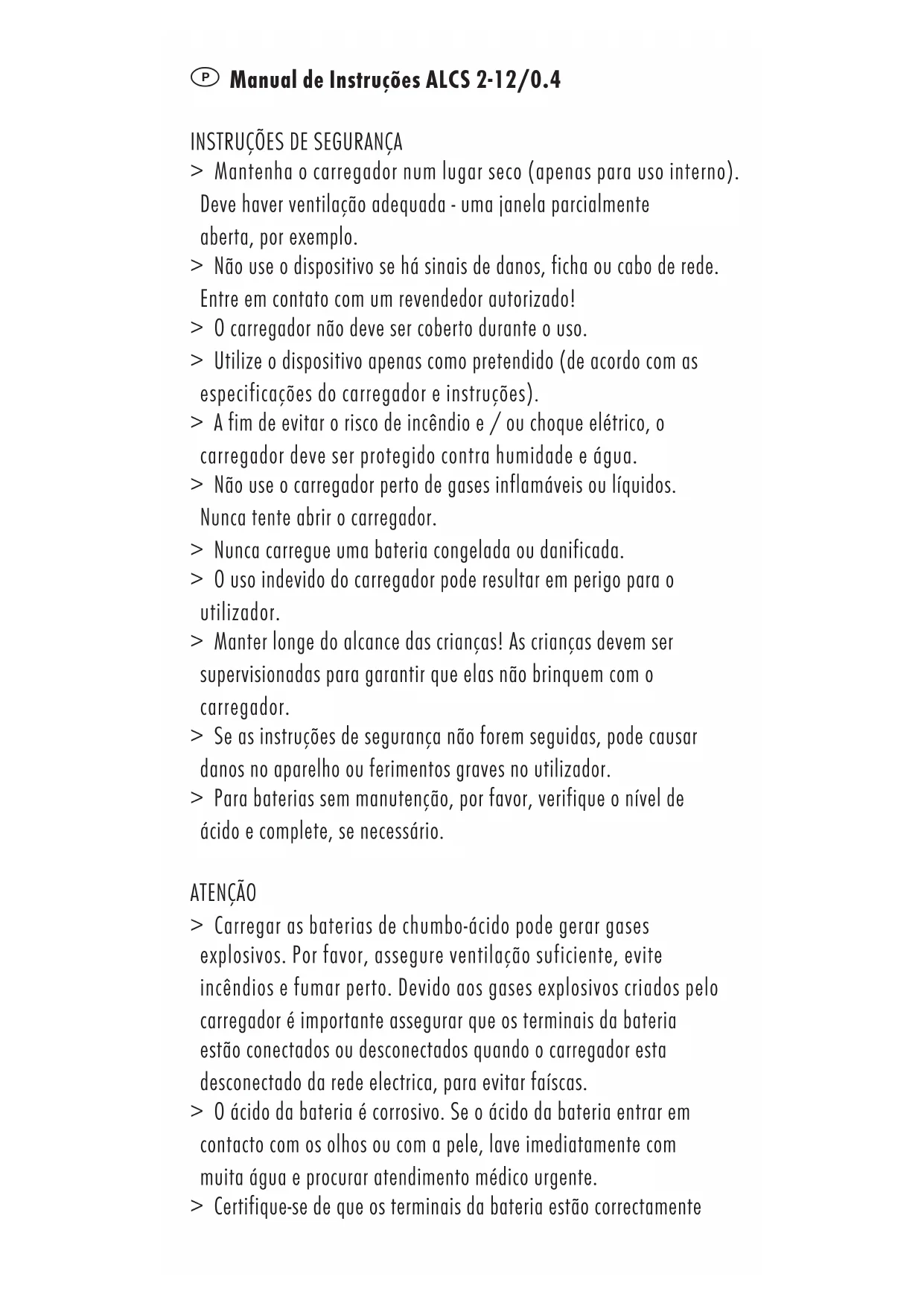 > Mantenha o carregador num lugar seco (apenas para uso interno). Deve haver ventilação adequada - uma janela parcialmente aberta, por exemplo. > Não use o dispositivo se há sinais de danos, ficha ou cabo de rede. Entre em contato com um revendedor autorizado! > O carregador não deve ser coberto durante o uso. > Utilize o dispositivo apenas como pretendido (de acordo com as especificações do carregador e instruções). > A fim de evitar o risco de incêndio e / ou choque elétrico, o carregador deve ser protegido contra humidade e água. > Não use o carregador perto de gases inflamáveis ou líquidos. Nunca tente abrir o carregador. > Nunca carregue uma bateria congelada ou danificada. > O uso indevido do carregador pode resultar em perigo para o utilizador. > Manter longe do alcance das crianças! As crianças devem ser supervisionadas para garantir que elas não brinquem com o carregador. > Se as instruções de segurança não forem seguidas, pode causar danos no aparelho ou ferimentos graves no utilizador. > Para baterias sem manutenção, por favor, verifique o nível de ácido e complete, se necessário. ATENÇÃO > Carregar as baterias de chumbo-ácido pode gerar gases explosivos. Por favor, assegure ventilação suficiente, evite incêndios e fumar perto. Devido aos gases explosivos criados pelo carregador é importante assegurar que os terminais da bateria estão conectados ou desconectados quando o carregador esta desconectado da rede electrica, para evitar faíscas. > O ácido da bateria é corrosivo. Se o ácido da bateria entrar em contacto com os olhos ou com a pele, lave imediatamente com muita água e procurar atendimento médico urgente. > Certifique-se de que os terminais da bateria estão correctamenteconectados (polaridade) (vermelho no pólo positivo, preto no pólo negativo). > A faísca pode surgir se o carregador estiver ligado à bateria enquanto ligado à corrente eléctrica. Por favor, garanta que ele está desconectado da rede elétrica antes de ligar ou desligar os fios vermelho e preto. FUNÇÕES > Carregador de baterias chumbo ácido 2V/6V/12V. > Proteção contra curto-circuito, polaridade errada e proteção da sobrecarga. > Carga com IU-curva > Indicado para carregamento do flutuador > Carga com ajuste de corrente COLOCAÇÃO