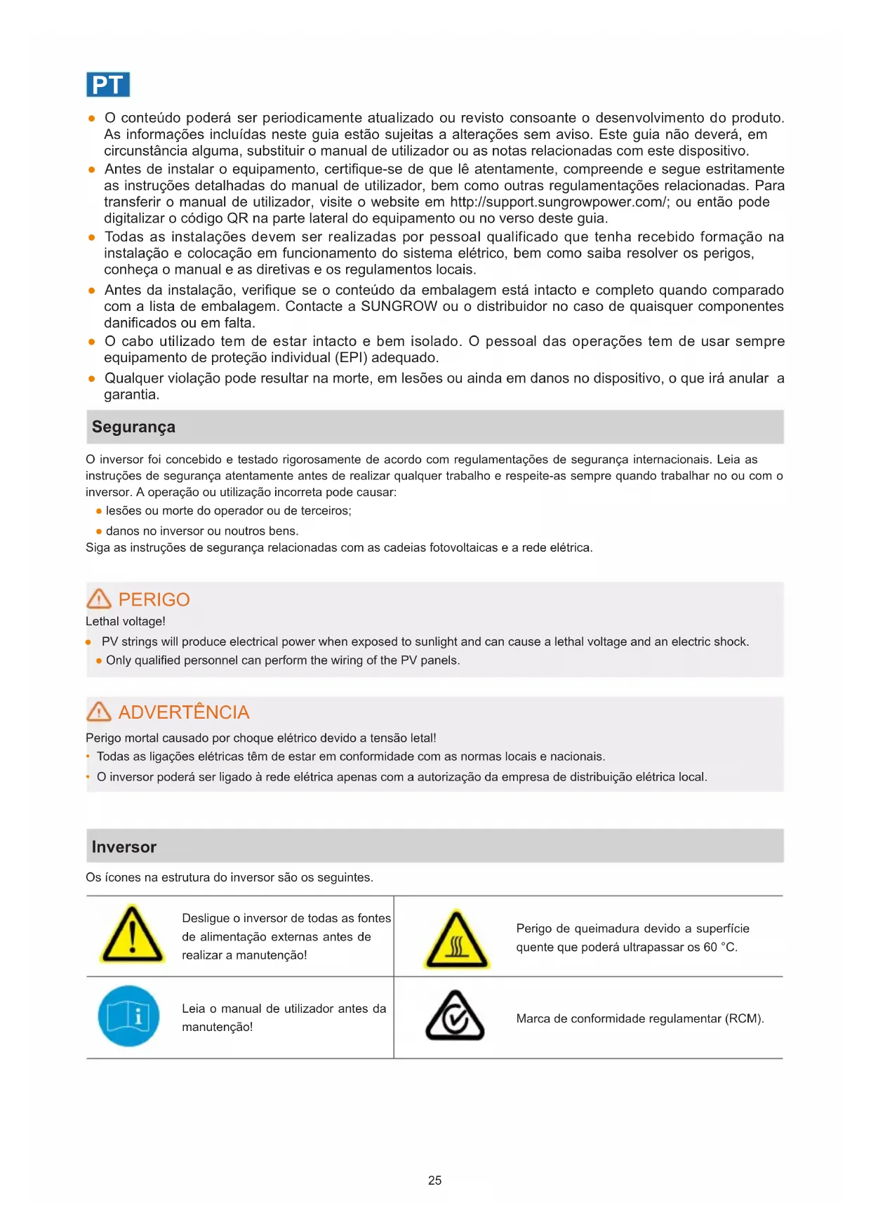 ● O conteúdo poderá ser periodicamente atualizado ou revisto consoante o desenvolvimento do produto. As informações incluídas neste guia estão sujeitas a alterações sem aviso. Este guia não deverá, em circunstância alguma, substituir o manual de utilizador ou as notas relacionadas com este dispositivo. ● Antes de instalar o equipamento, certique-se de que lê atentamente, compreende e segue estritamente as instruções detalhadas do manual de utilizador, bem como outras regulamentações relacionadas. Para transferir o manual de utilizador, visite o website em http://support.sungrowpower.com/; ou então pode digitalizar o código QR na parte lateral do equipamento ou no verso deste guia. ● Todas as instalações devem ser realizadas por pessoal qualificado que tenha recebido formação na instalação e colocação em funcionamento do sistema elétrico, bem como saiba resolver os perigos, conheça o manual e as diretivas e os regulamentos locais. ● Antes da instalação, verique se o conteúdo da embalagem está intacto e completo quando comparado com a lista de embalagem. Contacte a SUNGROW ou o distribuidor no caso de quaisquer componentes danicados ou em falta. ● O cabo utilizado tem de estar intacto e bem isolado. O pessoal das operações tem de usar sempre equipamento de proteção individual (EPI) adequado. ● Qualquer violação pode resultar na morte, em lesões ou ainda em danos no dispositivo, o que irá anular a garantia. Segurança O inversor foi concebido e testado rigorosamente de acordo com regulamentações de segurança internacionais. Leia as instruções de segurança atentamente antes de realizar qualquer trabalho e respeite-as sempre quando trabalhar no ou com o inversor. A operação ou utilização incorreta pode causar: ● lesões ou morte do operador ou de terceiros; ● danos no inversor ou noutros bens. Siga as instruções de segurança relacionadas com as cadeias fotovoltaicas e a rede elétrica. PERIGO Lethal voltage! ● PV strings will produce electrical power when exposed to sunlight and can cause a lethal voltage and an electric shock. ● Only qualied personnel can perform the wiring of the PV panels. ADVERTÊNCIA Perigo mortal causado por choque elétrico devido a tensão letal!