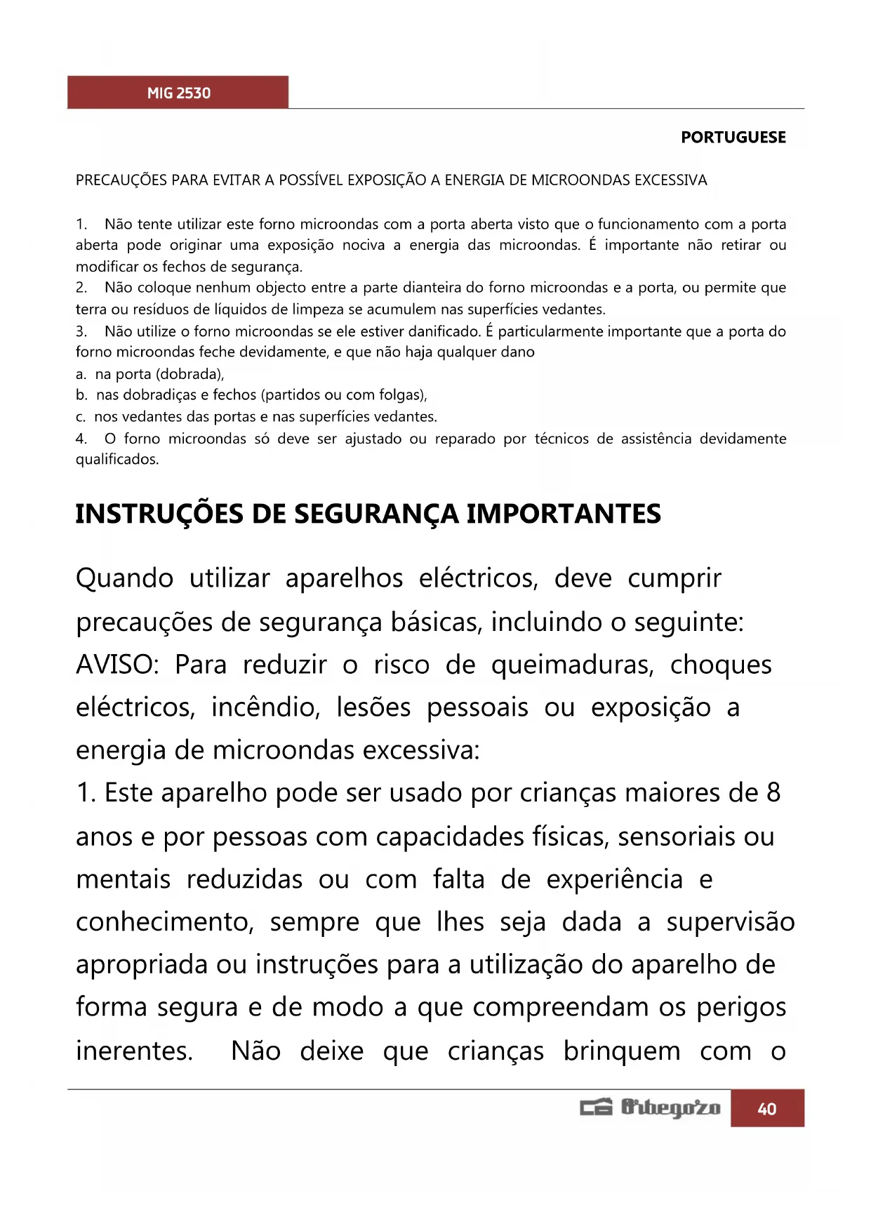 MIG 2530 - Micro-ondas Orbegozo - Manual de utilização gratuito