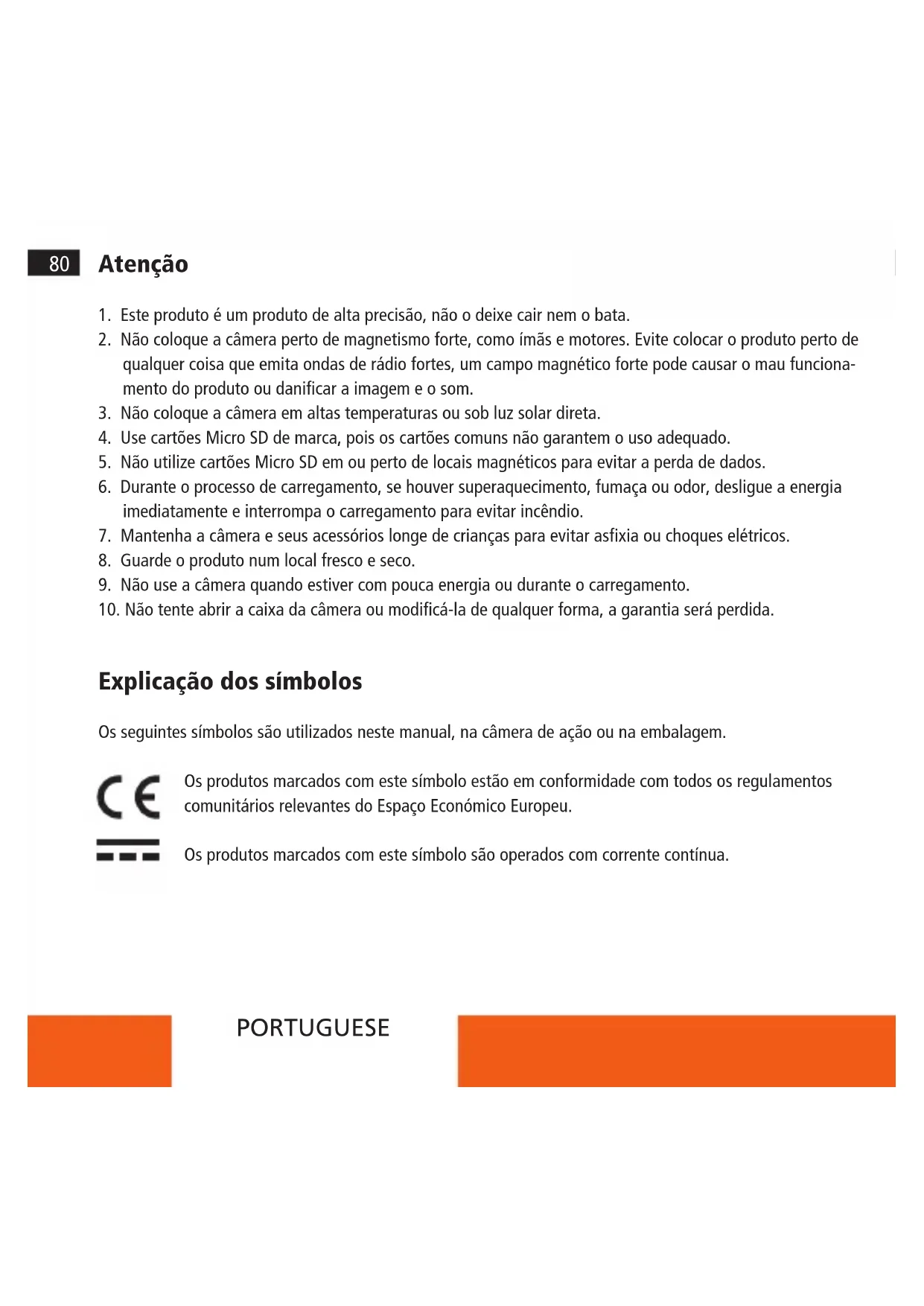 Explicação dos símbolos Os seguintes símbolos são utilizados neste manual, na câmera de ação ou na embalagem. Os produtos marcados com este símbolo estão em conformidade com todos os regulamentos comunitários relevantes do Espaço Económico Europeu. Os produtos marcados com este símbolo são operados com corrente contínua.81 Características do Produto Sensor de imagem resolução 1/3,06“, 13M Resolução de imagem fixa 20M (5120x3840) (interpolada), 16M (4640x3480) (interpolada), 14M (4320x3240) (interpolada), 10M (3648x2736), 8M (3264x2448), 5M (2592x1944), 2M (1600x1200) Resolução de vídeo 4K (3840x2160/60/30fps), 2.7K (2704x1520/30fps), 1080P (1920x1080/60/30fps), 720P (1280x720/120/60fps) Modo vídeo Normal, lapso de tempo, câmara lenta, câmara rápida, loop Modo de fotografia Simples, explosão, contagem decrescente, lapso de tempo, exposição longa Funções adicionais Balanço de brancos para debaixo de água, função webcam, estabilização electrónica da imagem Lente Lente Grande angular | abertura F = 2,8 | distância focal f: 2,75 mm Ecrã táctil de 2“ (tamanho do ecrã 5,08 cm) e ecrã de 1,33“ autocolante Slot de memória para cartões microSD de até SDXC 64 GB Formato dos dados Imagem fixa: JPG | Vídeo: MOV Conectores microUSB 2.0, microHDMI, ¼“ fio de tripé WiFi iEEE 802.11 /b/g/n 2,4 GHz Controlo remoto Incluído controlo remoto a 2,4 GHz Caixa à prova de água até 10m Duração da bateria Até 85 minutos com a bateria totalmente carregada (4K) Bateria de iões de lítio substituível (1000 mAh/3,7 Wh) Dimensões | Peso 65,5 x 43,8 x 26,5 mm | ca. 129 g / 109 g (com / sem bateria) Âmbito de fornecimento Rollei Actioncam 8s Plus, caixa de protecção subaquática para profundidades até 40m, controlo remoto de 2,4 GHz, bateria substituível, 8 suportes, monta- gem de capacete, fixador de gancho e laço, autocolantes, braçadeiras de cabo, cabo metálico, cabo USB e pano de lentes82 PORTUGUESE Descrição da Câmera Visor Frontal/Selfie Lentes Altifalante incorporado Ranhura Micro HDMI Ranhura Micro USB Ligação de 1/4“ de tripé Compartimento da bateria & Slot Micro SD Botão de Modo (prima 3s – mudar para visor frontal) Microfone embutido Botão de Disparo/Confirmação Botão de Alimentação/WiFi Código de operação Indicador de carga Tela sensível ao toque
