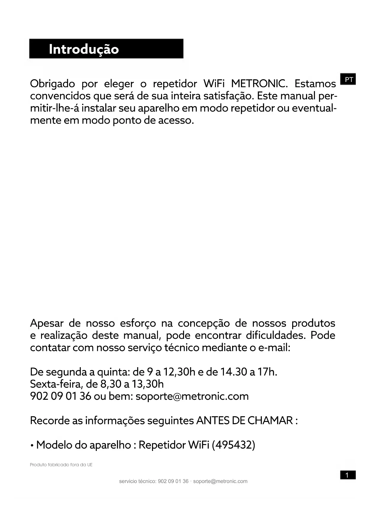 Introdução Produto fabricado fora da UE Obrigado por eleger o repetidor WiFi METRONIC. Estamos convencidos que será de sua inteira satisfação. Este manual per- mitir-lhe-á instalar seu aparelho em modo repetidor ou eventual- mente em modo ponto de acesso. Apesar de nosso esforço na concepção de nossos produtos e realização deste manual, pode encontrar dificuldades. Pode contatar com nosso serviço técnico mediante o e-mail: De segunda a quinta: de 9 a 12,30h e de 14.30 a 17h. Sexta-feira, de 8,30 a 13,30h 902 09 01 36 ou bem: soporte@metronic.com Recorde as informações seguintes ANTES DE CHAMAR :