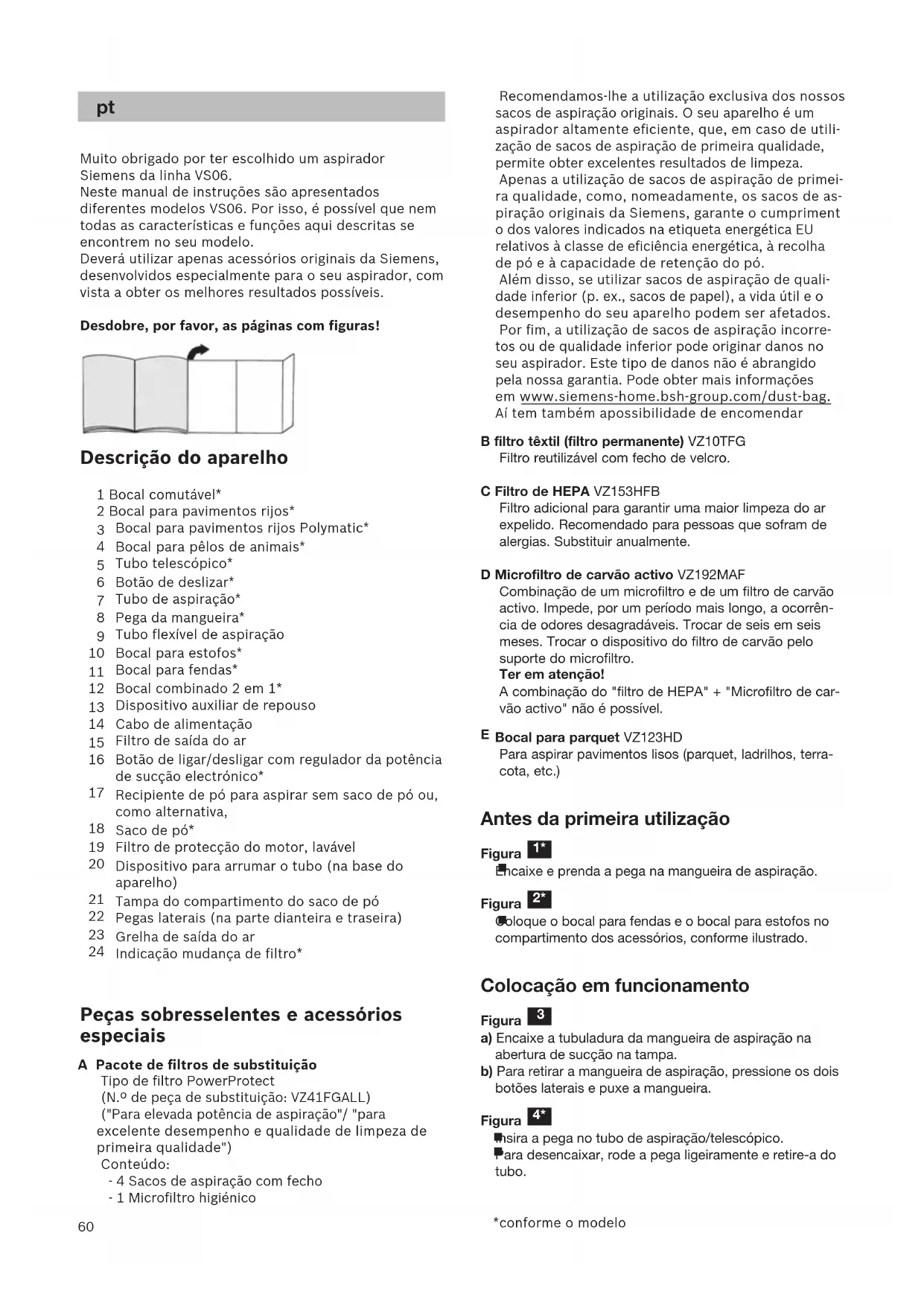 Muito obrigado por ter escolhido um aspirador Siemens da linha VS06. Neste manual de instruções são apresentados diferentes modelos VS06. Por isso, é possível que nem todas as características e funções aqui descritas se encontrem no seu modelo. Deverá utilizar apenas acessórios originais da Siemens, desenvolvidos especialmente para o seu aspirador, com vista a obter os melhores resultados possíveis. Desdobre, por favor, as páginas com figuras! Descrição do aparelho 1 Bocal comutável* 2 Bocal para pavimentos rijos* 3 Escova TURBO-UNIVERSAL