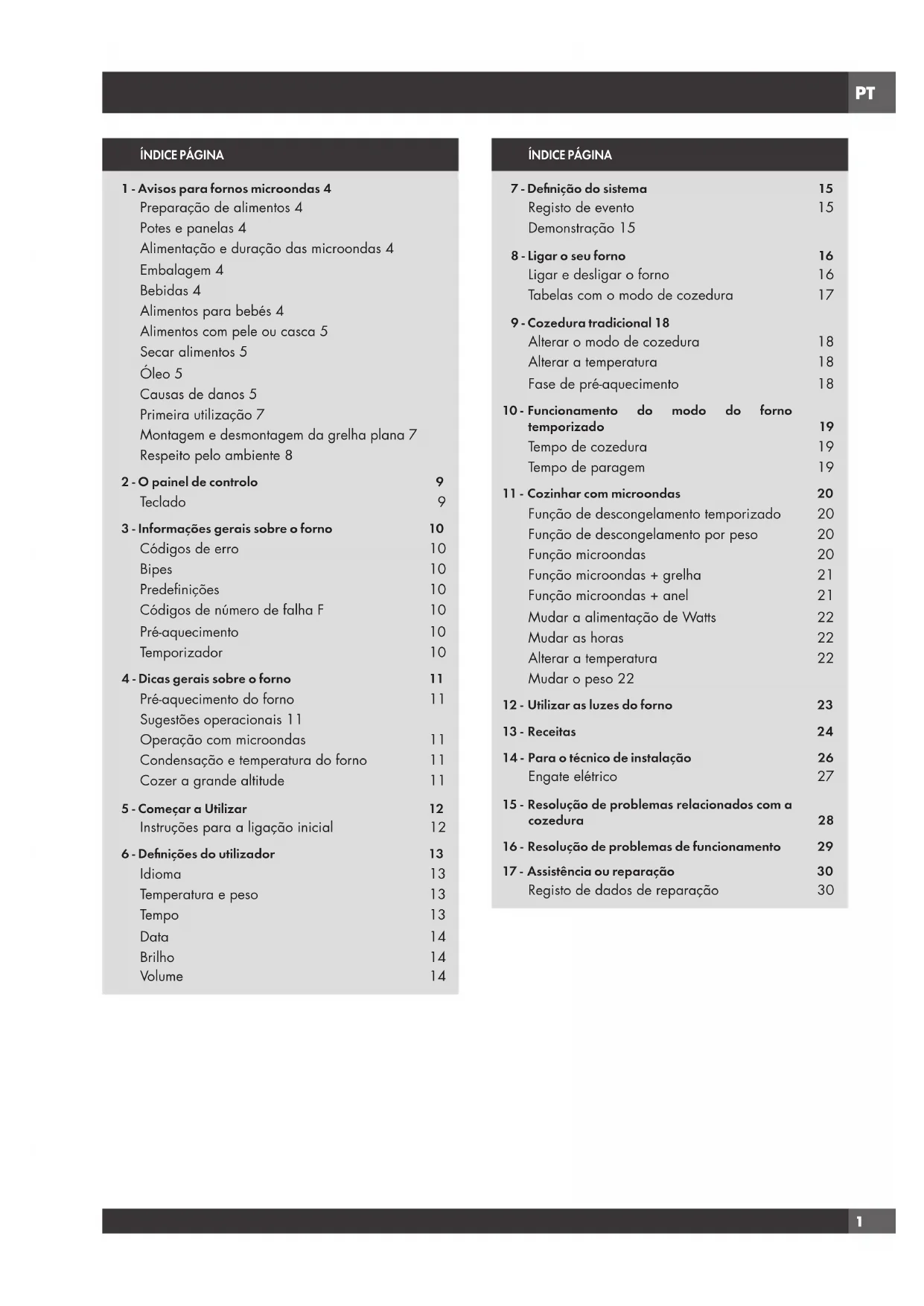 Códigos de erro 10 Bipes 10 Predefinições 10 Códigos de número de falha F 10 Pré-aquecimento 10 Temporizador 10