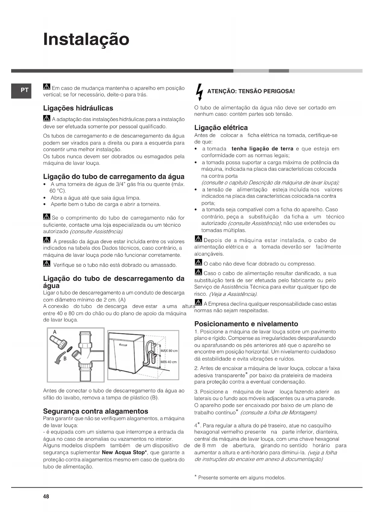 A pressão da água deve estar incluída entre os valores indicadosnatabeladosDadostécnicos,casocontrário,amáquina de lavar louça pode não funcionar corretamente. Verifique se o tubo não está dobrado ou amassado. Ligação do tubo de descarregamento da água Ligar o tubo de descarregamento a um conduto de descarga comdiâmetromínimode2cm.(A)Aconexão dotubo dedescarga deveestar auma alturaentre40e80cmdochãooudoplanodeapoiodamáquinade lavar louça.Antes de conectar o tubo de descarregamento da água ao sifãodolavabo,removaatampadeplástico(B). Segurança contra alagamentos Para garantir que não se verifiquem alagamentos, a máquina de lavar louça:-éequipadacomumsistemaqueinterrompeaentradadaágua no caso de anomalias ou vazamentos no interior.Algunsmodelosdispõem também deumdispositivo desegurança suplementar New Acqua Stop*, que garante a proteção contra alagamentos mesmo em caso de quebra do tubo de alimentação.ATENÇÃO: TENSÃO PERIGOSA!O tubo de alimentação da água não deve ser cortado em nenhumcaso:contémpartessobtensão. Ligação elétrica Antesde colocara fichaelétricanatomada,certifique-sede que:• atomada tenha ligação de terra e que esteja em conformidade com as normas legais;• atomadapossasuportaracargamáximadepotênciadamáquina, indicada na placa das características colocada na contra porta (consulteocapítuloDescriçãodamáquinadelavarlouça);