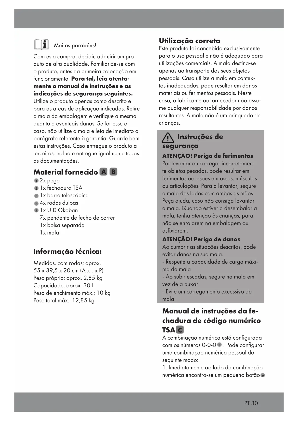 Obsah/ Índice de contenidos7 Material fornecido ............................................ Informação técnica ............................................. Utilização correta ................................................ Instruções de segurança ..................................... Perigo de ferimentos .................................... Perigo de danos ........................................... Manual de instruções da fechadura de código numérico TSA ..................................... Indicações adicionais ............................... Repor combinação numérica .............................. Okoban Tracking System .................................... Armazenagem ...................................................... Considerações relativas à eliminação ............... Limpeza ............................................................... Informações sobre garantia e processamento de serviço .................................. Condições de garantia ............................... Período de garantia e direitos legais em caso de defeitos .......................... Termos da garantia ................................... Procedimento em caso de garantia ......... Assistência ...........................................................