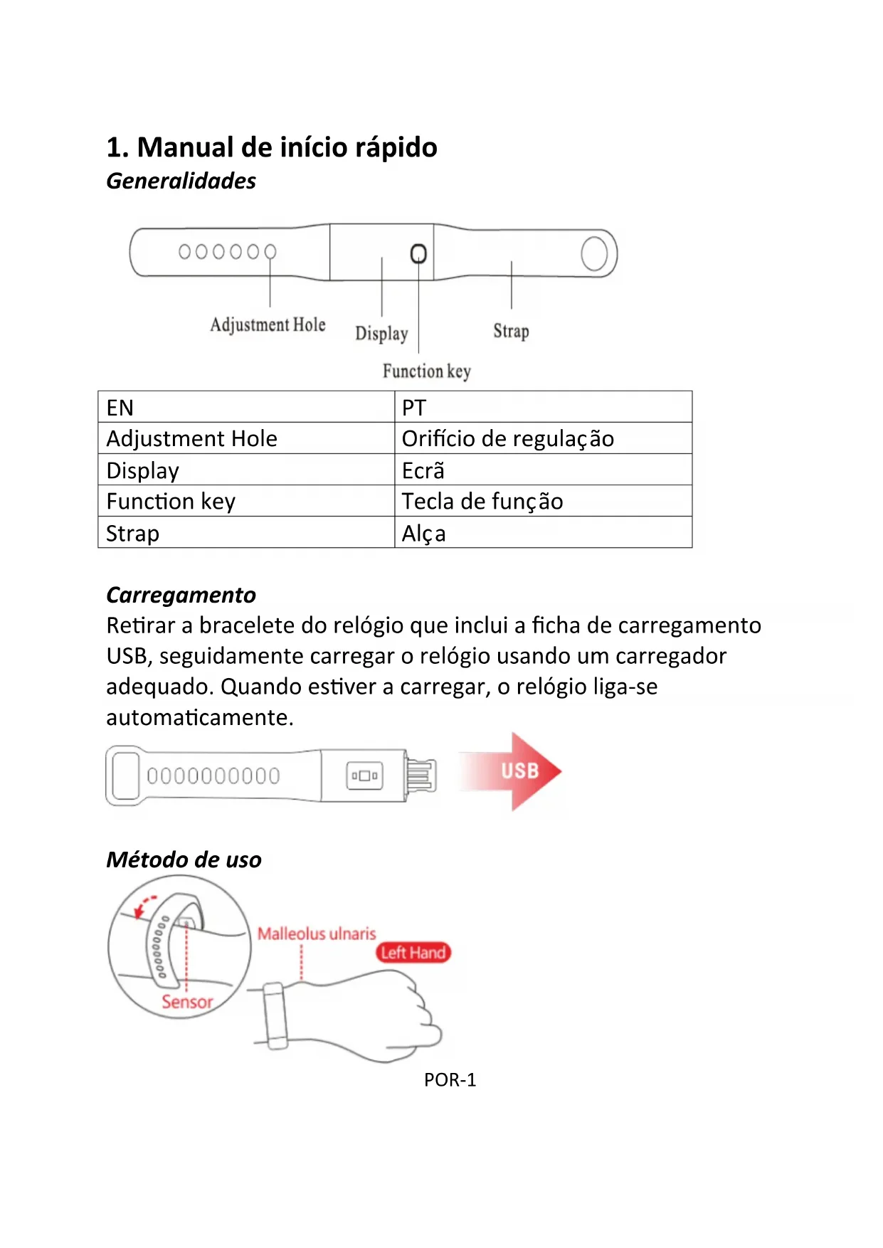 seu smartphone. Introdução operacional Pode levantar a mão ou premir a tecla de função para ativar o ecrã. Premir repetidamente a tecla de função para alternar entre asPOR-4 páginas do menu principal. Premir demoradamente a tecla de função para confirmar a seleção.