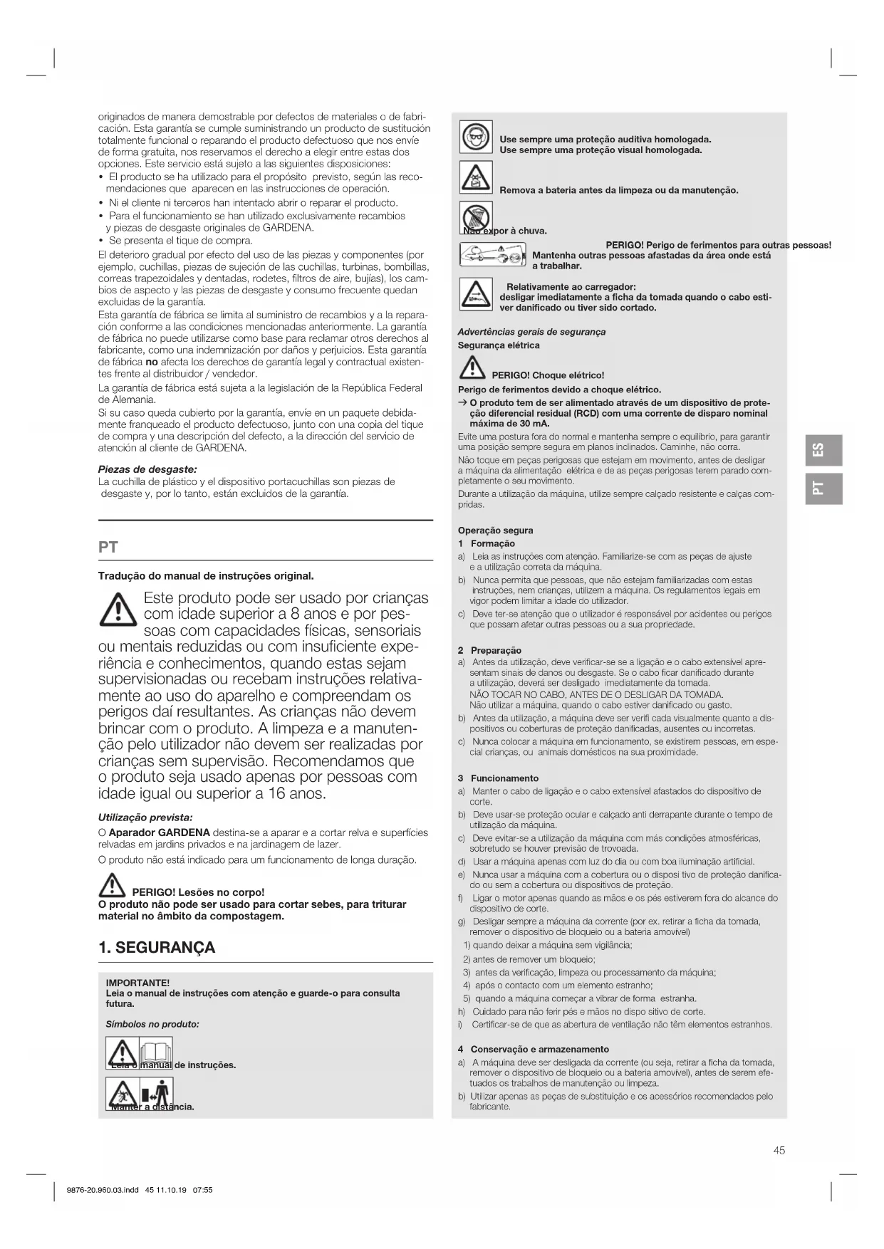 - Apresentação do comprovativo de compra. O desgaste normal de peças e componentes (por exemplo em lâminas, peças de fixação de lâminas, turbinas, lâmpadas, correias trapezoidais e dentadas, rodas impulsoras, filtros de ar, velas de ignição), alterações no aspeto, assim como peças de desgaste e consumíveis, estão excluídos da garantia. Esta garantia do fabricante limita-se ao fornecimento de peças sobres- salentes e à reparação de acordo com as condições acima referidas. Outras reivindicações relativamente ao fabricante, como indemnização por danos, não são justificadas pela garantia do fabricante. Esta garantia do fabricante não afeta os direitos legais e contratuais de garantia prestados pelo comerciante / vendedor. A garantia do fabricante está sujeita ao direito alemão. Em caso de garantia, envie por favor o produto com defeito devidamente franqueado juntamente com o comprovativo de compra e uma descrição da avaria para o endereço da assistência GARDENA. Peças de desgaste: A lâmina de plástico e o porta-lâminas são peças de desgaste e estão, por isso, excluídas da garantia.