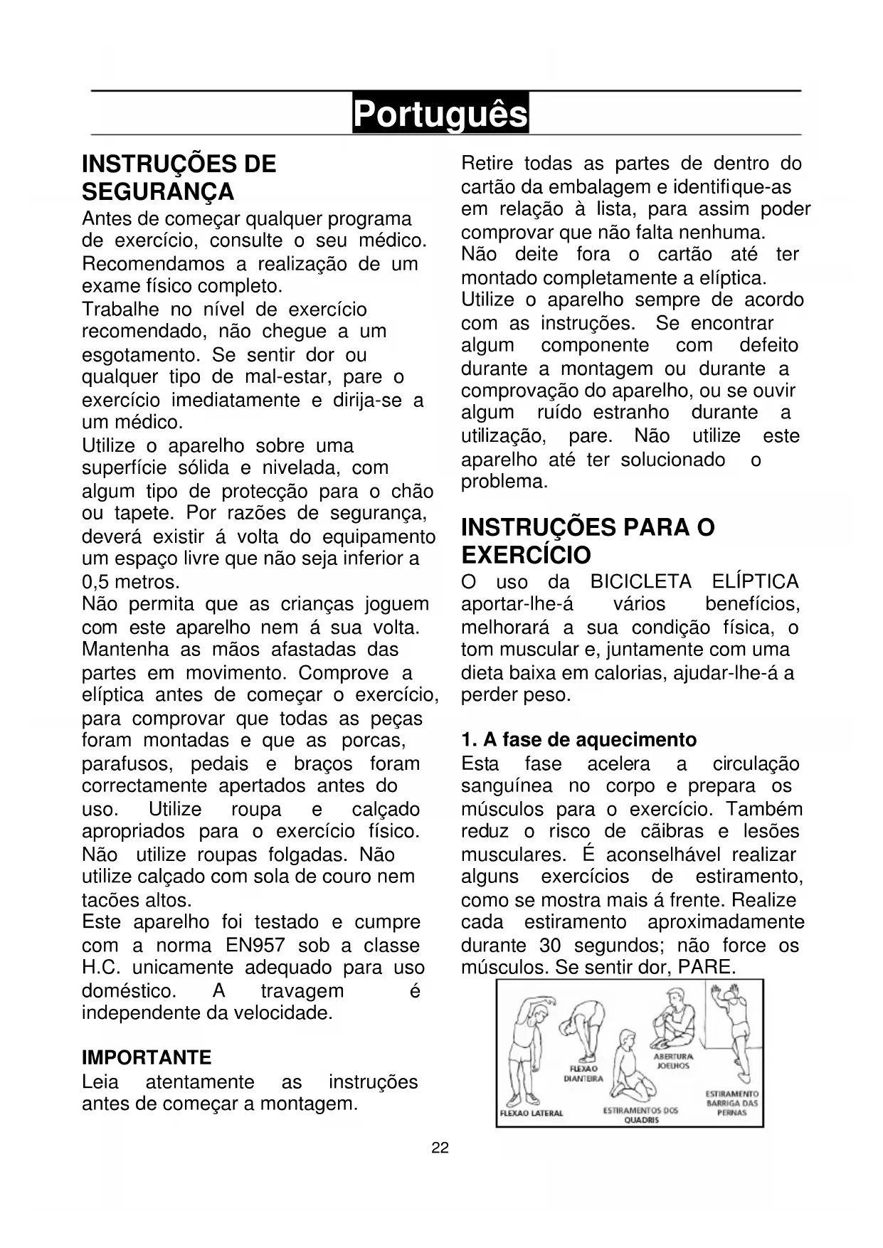 SEGURANÇA Antes de começar qualquer programa de exercício, consulte o seu médico. Recomendamos a realização de um exame físico completo. Trabalhe no nível de exercício recomendado, não chegue a um esgotamento. Se sentir dor ou qualquer tipo de mal-estar, pare o exercício imediatamente e dirija-se a um médico. Utilize o aparelho sobre uma superfície sólida e nivelada, com algum tipo de protecção para o chão ou tapete. Por razões de segurança, deverá existir á volta do equipamento um espaço livre que não seja inferior a 0,5 metros. Não permita que as crianças joguem com este aparelho nem á sua volta. Mantenha as mãos afastadas das partes em movimento. Comprove a elíptica antes de começar o exercício, para comprovar que todas as peças foram montadas e que as porcas, parafusos, pedais e braços foram correctamente apertados antes do uso. Utilize roupa e calçado apropriados para o exercício físico. Não utilize roupas folgadas. Não utilize calçado com sola de couro nem tacões altos. Este aparelho foi testado e cumpre com a norma EN957 sob a classe H.C. unicamente adequado para uso doméstico. A travagem é independente da velocidade. IMPORTANTE Leia atentamente as instruções antes de começar a montagem. Retire todas as partes de dentro do cartão da embalagem e identifi que-as em relação à lista, para assim poder comprovar que não falta nenhuma. Não deite fora o cartão até ter montado completamente a elíptica. Utilize o aparelho sempre de acordo com as instruções. Se encontrar algum componente com defeito durante a montagem ou durante a comprovação do aparelho, ou se ouvir algum ruído estranho durante a utilização, pare. Não utilize este aparelho até ter solucionado o problema.