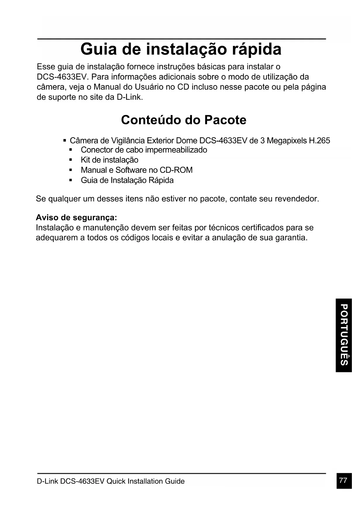 PORTUGUÊS Guia de instalação rápida Esse guia de instalação fornece instruções básicas para instalar o DCS-4633EV. Para informações adicionais sobre o modo de utilização da câmera, veja o Manual do Usuário no CD incluso nesse pacote ou pela página de suporte no site da D-Link. Conteúdo do Pacote Câmera de Vigilância Exterior Dome DCS-4633EV de 3 Megapixels H.265 Conector de cabo impermeabilizado Kit de instalação Manual e Software no CD-ROM Guia de Instalação Rápida Se qualquer um desses itens não estiver no pacote, contate seu revendedor. Aviso de segurança: Instalação e manutenção devem ser feitas por tcnicos certicados para se adequarem a todos os códigos locais e evitar a anulação de sua garantia.D-Link DCS-4633EV Quick Installation Guide