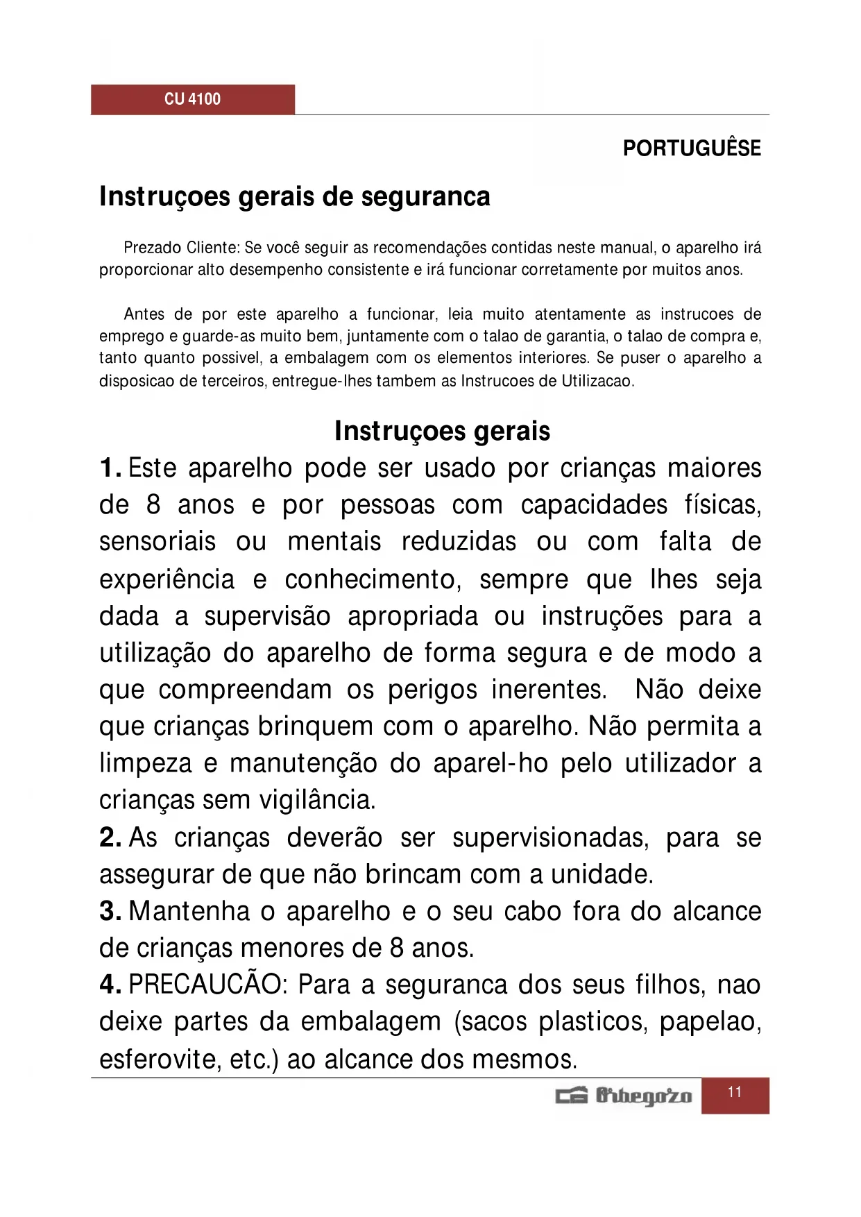 deixe partes da embalagem (sacos plasticos, papelao, esferovite, etc.) ao alcance dos mesmos.CU 4100