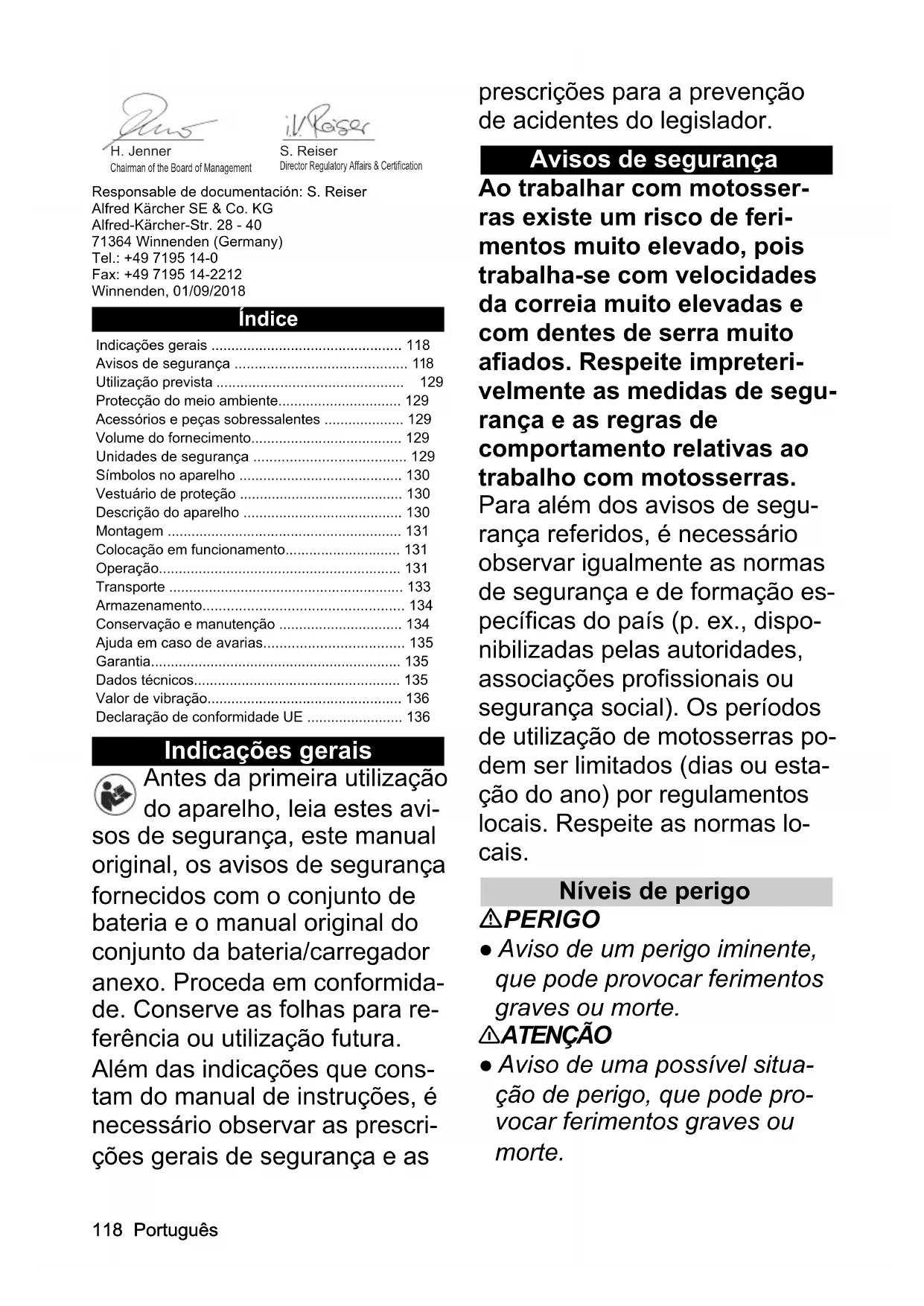 - Longitud del carril de guía mm 356 Longitud de corte mm 300 Paso de cadena in (mm) 0,375 (9,525) Peso (sin batería) kg 4,3118 Português Responsable de documentación: S. Reiser Alfred Kärcher SE & Co. KG Alfred-Kärcher-Str. 28 - 40 71364 Winnenden (Germany) Tel.: +49 7195 14-0 Fax: +49 7195 14-2212 Winnenden, 01/09/2018 Índice Indicações gerais Antes da primeira utilização do aparelho, leia estes avi- sos de segurança, este manual original, os avisos de segurança fornecidos com o conjunto de bateria e o manual original do conjunto da bateria/carregador anexo. Proceda em conformida- de. Conserve as folhas para re- ferência ou utilização futura. Além das indicações que cons- tam do manual de instruções, é necessário observar as prescri- ções gerais de segurança e as prescrições para a prevenção de acidentes do legislador. Avisos de segurança Ao trabalhar com motosser- ras existe um risco de feri- mentos muito elevado, pois trabalha-se com velocidades da correia muito elevadas e com dentes de serra muito afiados. Respeite impreteri- velmente as medidas de segu- rança e as regras de comportamento relativas ao trabalho com motosserras. Para além dos avisos de segu- rança referidos, é necessário observar igualmente as normas de segurança e de formação es- pecíficas do país (p. ex., dispo- nibilizadas pelas autoridades, associações profissionais ou segurança social). Os períodos de utilização de motosserras po- dem ser limitados (dias ou esta- ção do ano) por regulamentos locais. Respeite as normas lo- cais. Níveis de perigo PERIGO ● Aviso de um perigo iminente, que pode provocar ferimentos graves ou morte. 몇 ATENÇÃO ● Aviso de uma possível situa- ção de perigo, que pode pro- vocar ferimentos graves ou morte. Indicações gerais p. 118