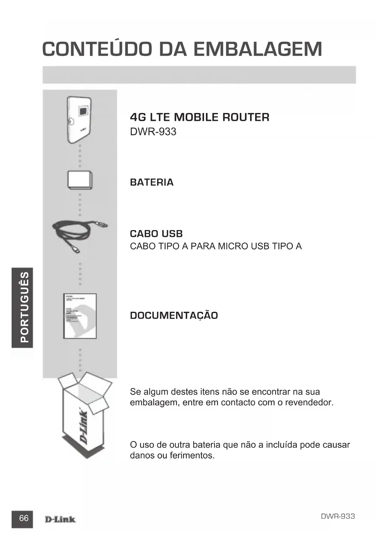 5 GHz SSID: dlink_DWR-933-5G-xxxx Palavra-passe: xxxxxxxxxx (xxxx é um código de 4 caracteres exclusivo do seu DWR-933) Passo 1: Ligue o DWR-933 mantendo pressionado o botão de energia até ser exibida a mensagem "Bem-vindo" no visor. CONFIGuRAÇÃO LiGAR o SEu DiSPoSiTiVo - ATRAVÉS DE uMA LiGAÇÃo SEM FioS Passo 4: Use os menus no ecrã para congurar o dispositivo.69 DWR-933 PORTUGUÊS LiGAR o SEu DiSPoSiTiVo - ATRAVÉS DE CAbo uSb Passo 2: Ligue o DWR-933 ao seu computador através do cabo USB. O dispositivo deve instalar automaticamente em sistemas operativos modernos. Passo 3: Utilize um navegador de Internet para aceder a 192.168.0.1 e iniciar sessão na interface de conguração. Por predenição, o nome de utilizador é "admin" e o campo da palavra-passe deve car em branco. Passo 1: Ligue o DWR-933 mantendo pressionado o botão de energia até ser exibida a mensagem "Bem-vindo" no visor. Passo 4: Use os menus no ecrã para congurar o dispositivo.70 DWR-933 PORTUGUÊS ASSiSTÊNCiA TÉCNiCA eu.dlink.com/support RESOLuÇÃO DE PRObLEMAS PRobLEMAS DE DEFiNiÇÃo E CoNFiGuRAÇÃo