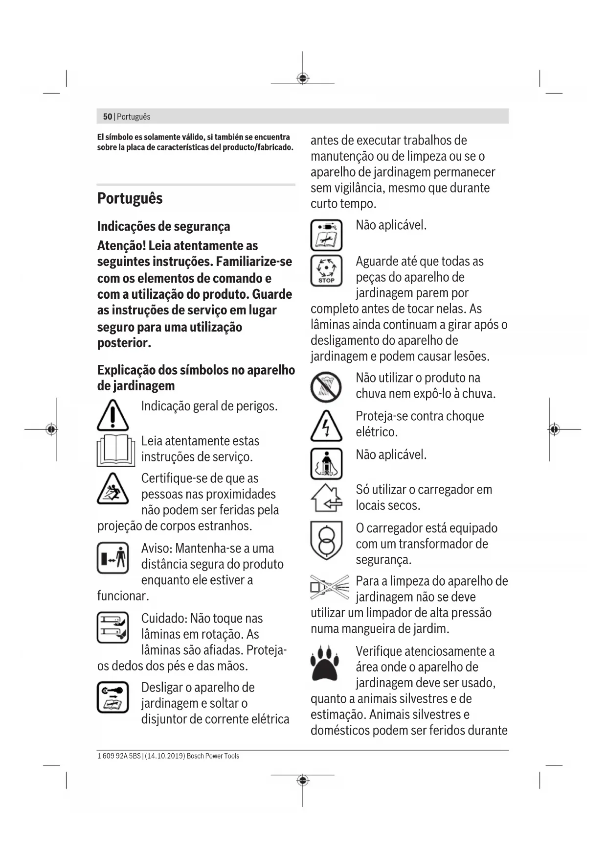 Santiago de Chile Tel.: (56) 02 782 0200 www.bosch.cl Ecuador Robert Bosch Sociedad Anónima Av. Rodrigo Chávez Gonzalez, Parque Empresarial Colón, Edif. Coloncorp Piso 1 Local 101-102 Guayaquil Tel.: (593) 3719100ext.214-215 E-mail: herramientas.bosch4@ec.bosch.com www.boschherramientas.com.ec México Robert Bosch S. de R.L. de C.V. Calle Robert Bosch No. 405 C.P. 50071 Zona Industrial, Toluca - Estado de México Tel.: (52) 55 528430-62 Tel.: 800 6271286 www.bosch-herramientas.com.mx Perú Robert Bosch S.A.C. Av. Primavera 781 Piso 2, Urb. Chacarilla San Borja Lima Tel.: (51) 1 706 1100 www.bosch.com.pe Venezuela Robert Bosch S.A. Calle Vargas con Buen Pastor, Edif. Alba, P-1, Boleita Norte, Caracas 1071 Tel.: (58) 212 207-4511 www.boschherramientas.com.ve Transporte Los acumuladores de iones de litio incorporados están suje- tos a los requerimientos estipulados en la legislación sobre mercancías peligrosas. Los acumuladores pueden ser trans- portados por carretera por el usuario sin más imposiciones. En el caso de un envío por terceros (p. ej., transporte aéreo o agencia de transportes) deberán considerarse las exigen- cias especiales en cuanto a su embalaje e identificación. En ese caso deberá recurrirse a un experto en mercancías peli- grosas al preparar la pieza para su envío. Únicamente envíe acumuladores si su carcasa no está daña- da. Si los contactos no van protegidos cúbralos con cinta adhesiva y embale el acumulador de manera que éste no se pueda mover dentro del embalaje. Observe también la nor- mativa nacional aplicable. Eliminación Los aparatos para jardín, acumuladores, acce- sorios y embalajes deberán someterse a un proceso de recuperación que respete el medio ambiente. ¡No arroje los aparatos para jardín, acumulado- res o pilas a la basura! Sólo para los países de laUE: Los aparatos eléctricos y electrónicos inservibles, así como los acumuladores/pilas defectuosos o agotados deberán acumularse por separado para ser sometidos a un reciclaje ecológico tal como lo marcan las Directivas Europeas 2012/19/EU y 2006/66/CE, respectivamente. Acumuladores/pilas: Iones de Litio: Observe las indicaciones comprendidas en el apartado Transporte. Bosch Power Tools 1 609 92A 5BS | (14.10.2019)50 | Português El símbolo es solamente válido, si también se encuentra sobre la placa de características del producto/fabricado. Português Indicações de segurança Atenção! Leia atentamente as seguintes instruções. Familiarize-se com os elementos de comando e com a utilização do produto. Guarde as instruções de serviço em lugar seguro para uma utilização posterior. Explicação dos símbolos no aparelho de jardinagem Indicação geral de perigos. Leia atentamente estas instruções de serviço. Certifique-se de que as pessoas nas proximidades não podem ser feridas pela projeção de corpos estranhos. Aviso: Mantenha-se a uma distância segura do produto enquanto ele estiver a funcionar. Cuidado: Não toque nas lâminas em rotação. As lâminas são afiadas. Proteja- os dedos dos pés e das mãos. Desligar o aparelho de jardinagem e soltar o disjuntor de corrente elétrica antes de executar trabalhos de manutenção ou de limpeza ou se o aparelho de jardinagem permanecer sem vigilância, mesmo que durante curto tempo. Não aplicável. Aguarde até que todas as peças do aparelho de jardinagem parem por completo antes de tocar nelas. As lâminas ainda continuam a girar após o desligamento do aparelho de jardinagem e podem causar lesões. Não utilizar o produto na chuva nem expô-lo à chuva. Proteja-se contra choque elétrico. Não aplicável. Só utilizar o carregador em locais secos. O carregador está equipado com um transformador de segurança. Para a limpeza do aparelho de jardinagem não se deve utilizar um limpador de alta pressão numa mangueira de jardim. Verifique atenciosamente a área onde o aparelho de jardinagem deve ser usado, quanto a animais silvestres e de estimação. Animais silvestres e domésticos podem ser feridos durante 1 609 92A 5BS | (14.10.2019) Bosch Power ToolsPortuguês | 51 a operação da máquina. Verifique atenciosamente a área de uso da máquina e remova todas as pedras, paus, fios, ossos e objetos estranhos. Ao usar a máquina, certifique-se de que não haja animais silvestres, animais de estimação ou pequenos tocos de árvores escondidos na grama densa. Operação u Jamais permitir que crianças ou pessoas não familiarizadas com estas instruções utilizem o produto. As diretivas nacionais podem limitar a idade do utilizador. Quando não estiver em uso, o produto deverá ser guardado em local inacessível para crianças. u Jamais se deve permitir que as crianças e pessoas com capacidades físicas, sensoriais ou mentais limitadas ou com falta de experiência e/ou falta de conhecimento e/ou não familiarizadas com estas instruções utilizem o produto. As diretivas nacionais podem limitar a idade do utilizador. u Crianças devem ser supervisionadas para garantir que elas não brinquem com o produto. u Jamais utilizar o aparelho de jardinagem enquanto pessoas, especialmente crianças, ou animais e estiverem ao redor. u O operador ou o utilizador é responsável por acidentes ou danos, se outras pessoas forem feridas e se as suas propriedades forem danificadas. u Não devem ser usados sapatos de borracha abertos nem sandálias ao usar o produto. Sempre usar sapatos robustos e calças longas. u Controlar cuidadosamente a superfície a ser trabalhada e remover pedras, gravetos, arames, ossos e quaisquer outros corpos estranhos. u Antes a utilização deverá sempre controlar se as lâminas, os parafusos das lâminas e o módulo de corte estão gastos ou danificados. Lâminas e parafusos de lâminas gastos ou danificados devem sempre ser substituídos por completo, para evitar desequilíbrios. u Só cortar relva à luz do dia ou com boa iluminação artificial. u Em condições climáticas desfavoráveis, espe