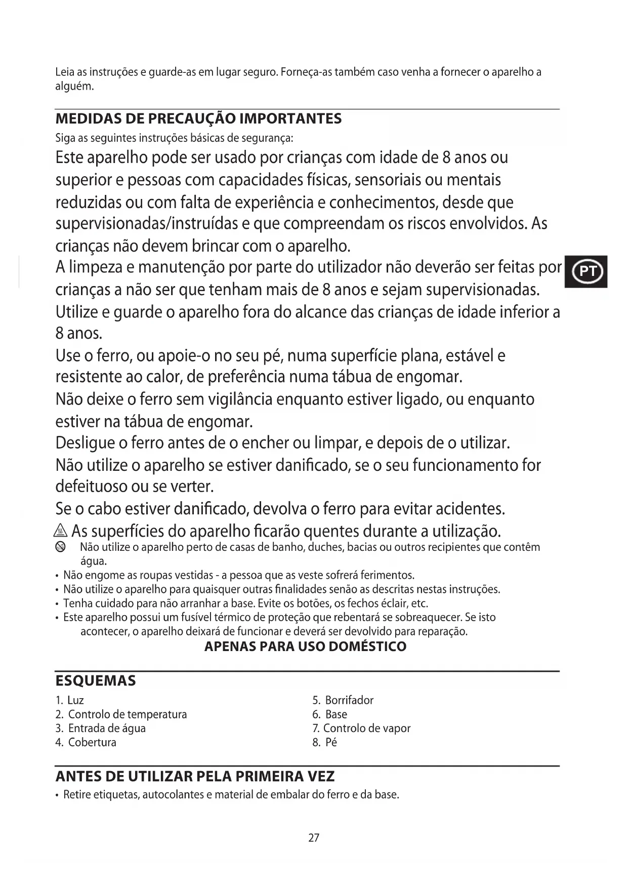 Siga as seguintes instruções básicas de segurança: Este aparelho pode ser usado por crianças com idade de 8 anos ou superior e pessoas com capacidades físicas, sensoriais ou mentais reduzidas ou com falta de experiência e conhecimentos, desde que supervisionadas/instruídas e que compreendam os riscos envolvidos. As crianças não devem brincar com o aparelho. A limpeza e manutenção por parte do utilizador não deverão ser feitas por crianças a não ser que tenham mais de 8 anos e sejam supervisionadas. Utilize e guarde o aparelho fora do alcance das crianças de idade inferior a 8 anos. Use o ferro, ou apoie-o no seu pé, numa superfície plana, estável e resistente ao calor, de preferência numa tábua de engomar. Não deixe o ferro sem vigilância enquanto estiver ligado, ou enquanto estiver na tábua de engomar. Desligue o ferro antes de o encher ou limpar, e depois de o utilizar. Não utilize o aparelho se estiver danicado, se o seu funcionamento for defeituoso ou se verter. Se o cabo estiver danicado, devolva o ferro para evitar acidentes. h As superfícies do aparelho carão quentes durante a utilização. b Não utilize o aparelho perto de casas de banho, duches, bacias ou outros recipientes que contêm água.