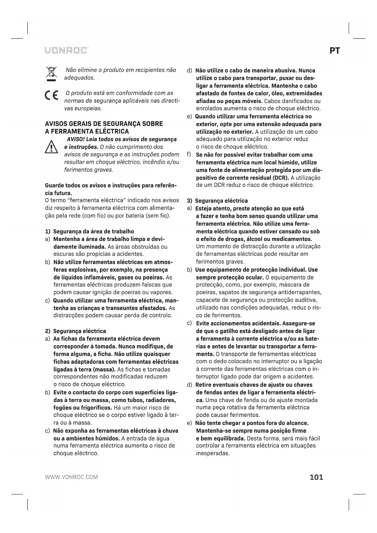 GARANTIA Os produtos da VONROC são desenvolvidos de acordo com os padrões de qualidade mais ele- vados enão apresentam quaisquer defeitos em termos de materiais emão-de-obra em relação ao período estipulado por lei, cujo início é apartir da data de compra original. Se oproduto apresentar qualquer falha durante este período devido aqual- quer defeito no material e/ou de mão-de-obra, contacte aVONROC directamente. As seguintes circunstâncias estão excluídas desta garantia: